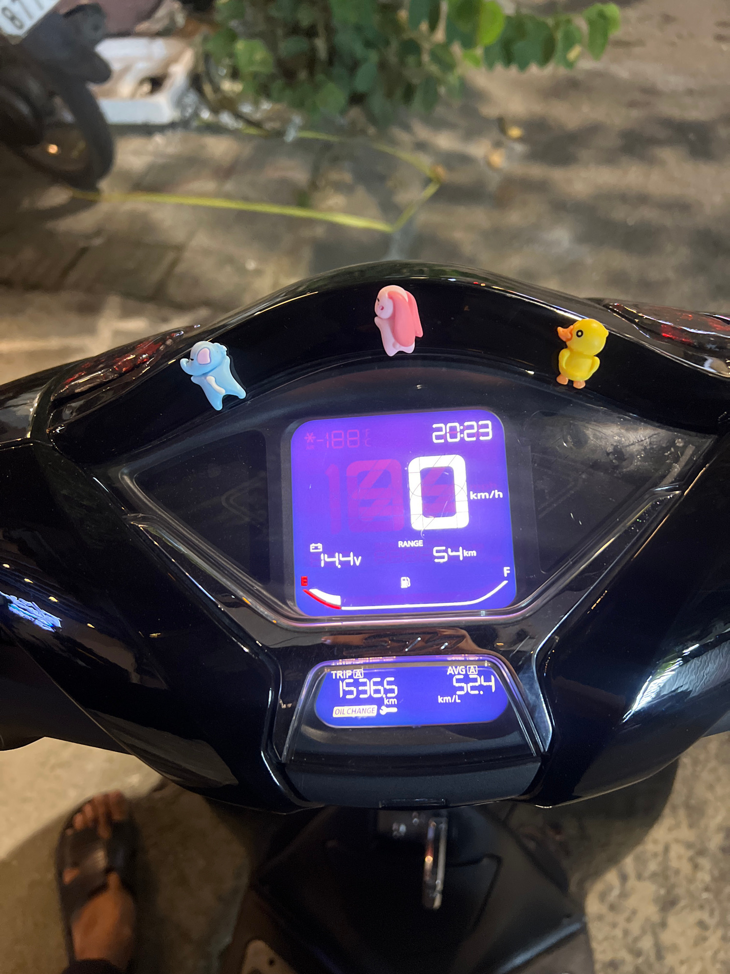 The image shows the dashboard of a motorcycle. The dashboard is black and has a digital display that shows the time as 20:23, the speedometer reading as 0 km/h, the remaining range as 54 km, the volta…read more