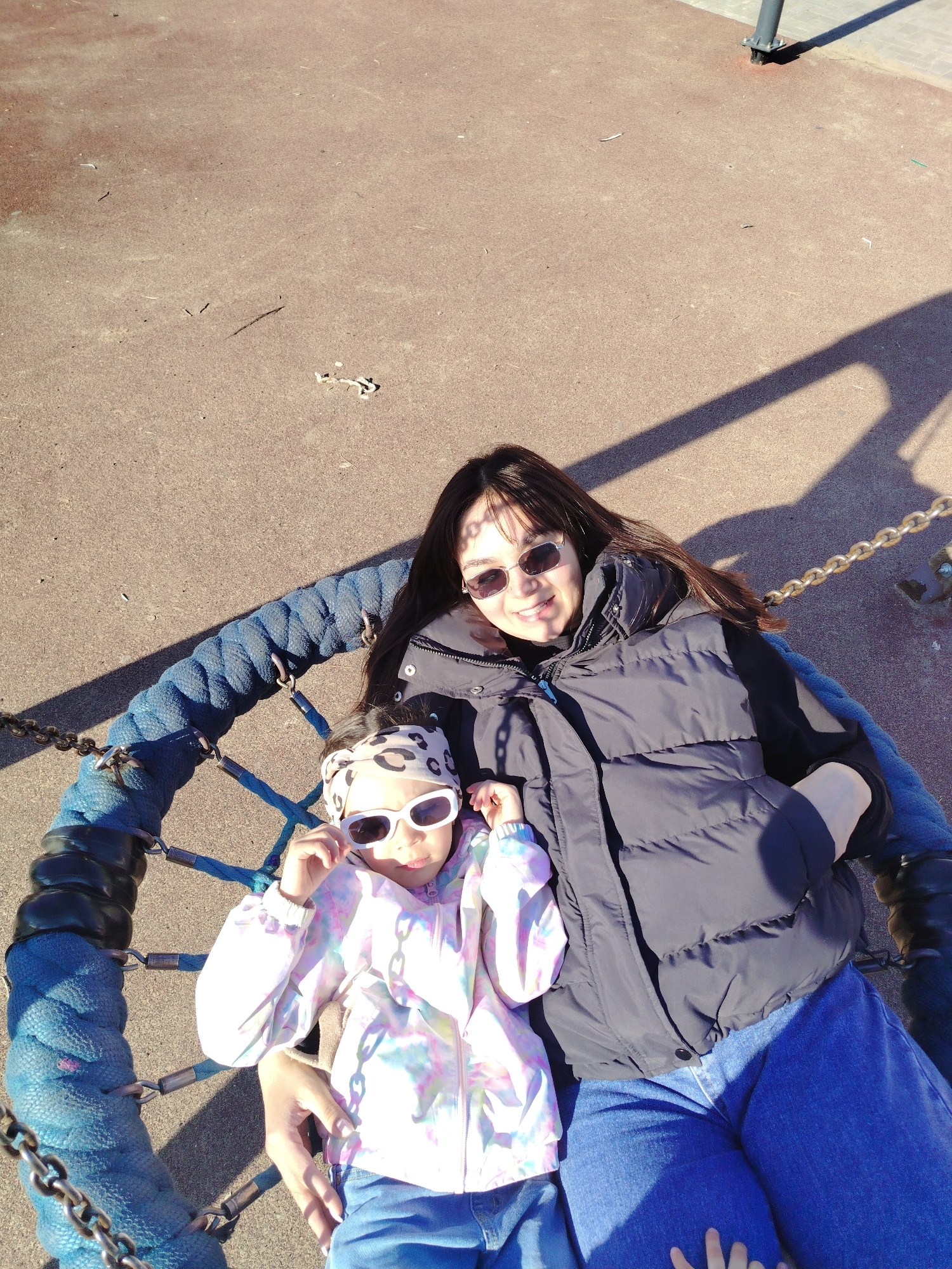 The image provides an overhead view of an adult woman and a young girl sitting together on a large, circular swing at an outdoor playground in Noviy, Russia. The swing features a thick blue rope wrapp…read more