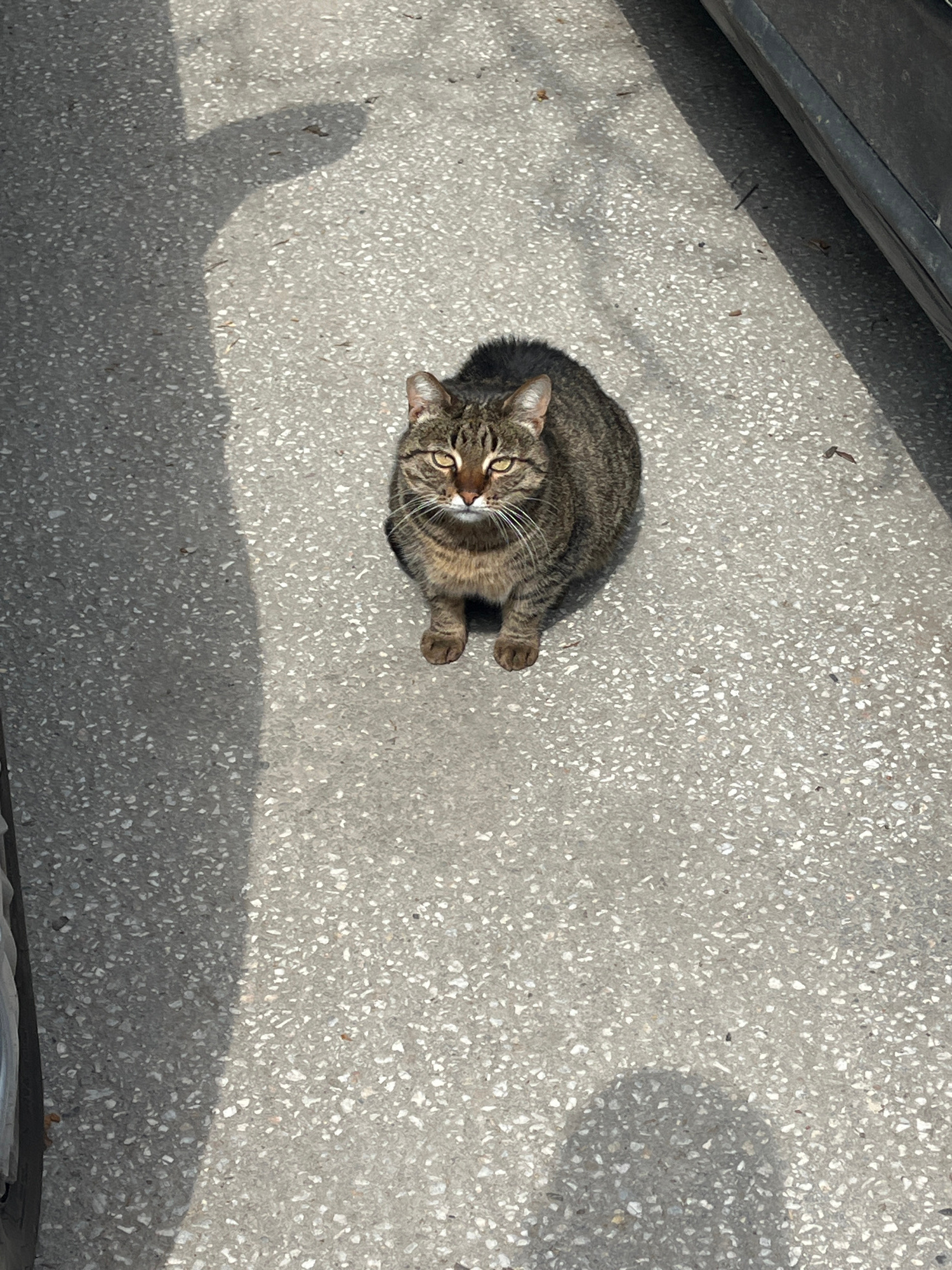 A gray tabby cat sits on a gray concrete surface, possibly a sidewalk or parking area. The cat faces the camera with its ears perked and eyes open. A shadow cast by the cat and other objects, includin…read more