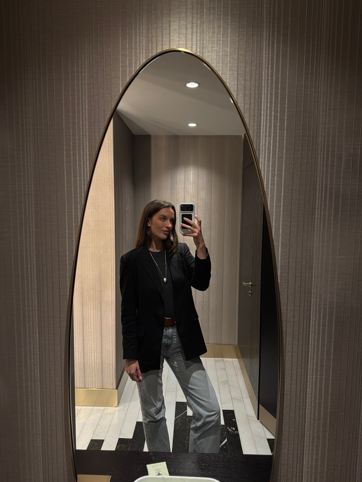 A woman is taking a selfie in an oval mirror. The mirror is reflecting her standing in a room with horizontally textured walls. She is wearing a black blazer, a necklace, and light gray jeans. The flo…read more