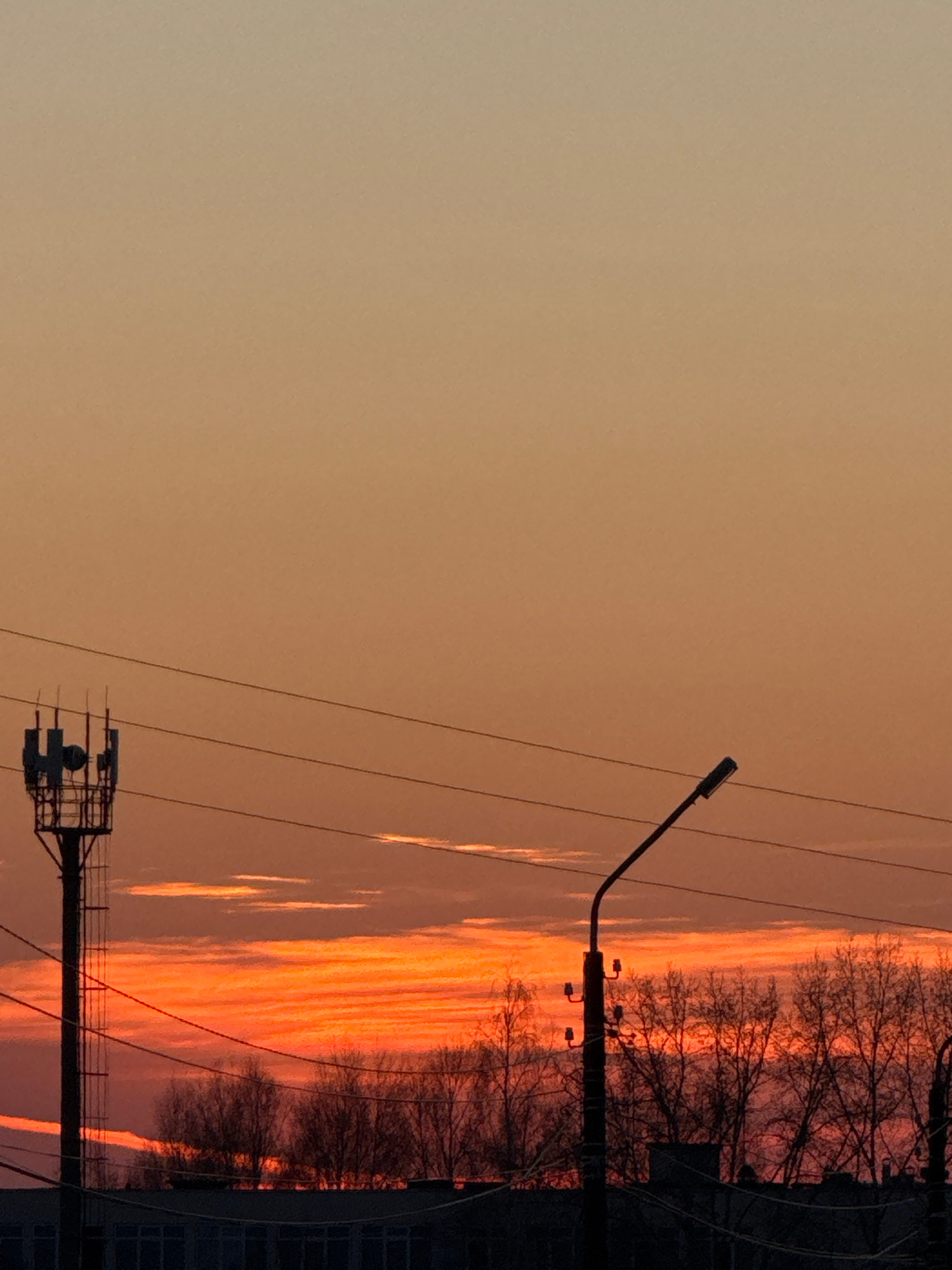 The image depicts an orange sky, likely at sunset or sunrise, in Прикамский, Russia. Silhouetted against the sky are bare trees, utility poles, and a street light. There's a building visible on the ri…read more