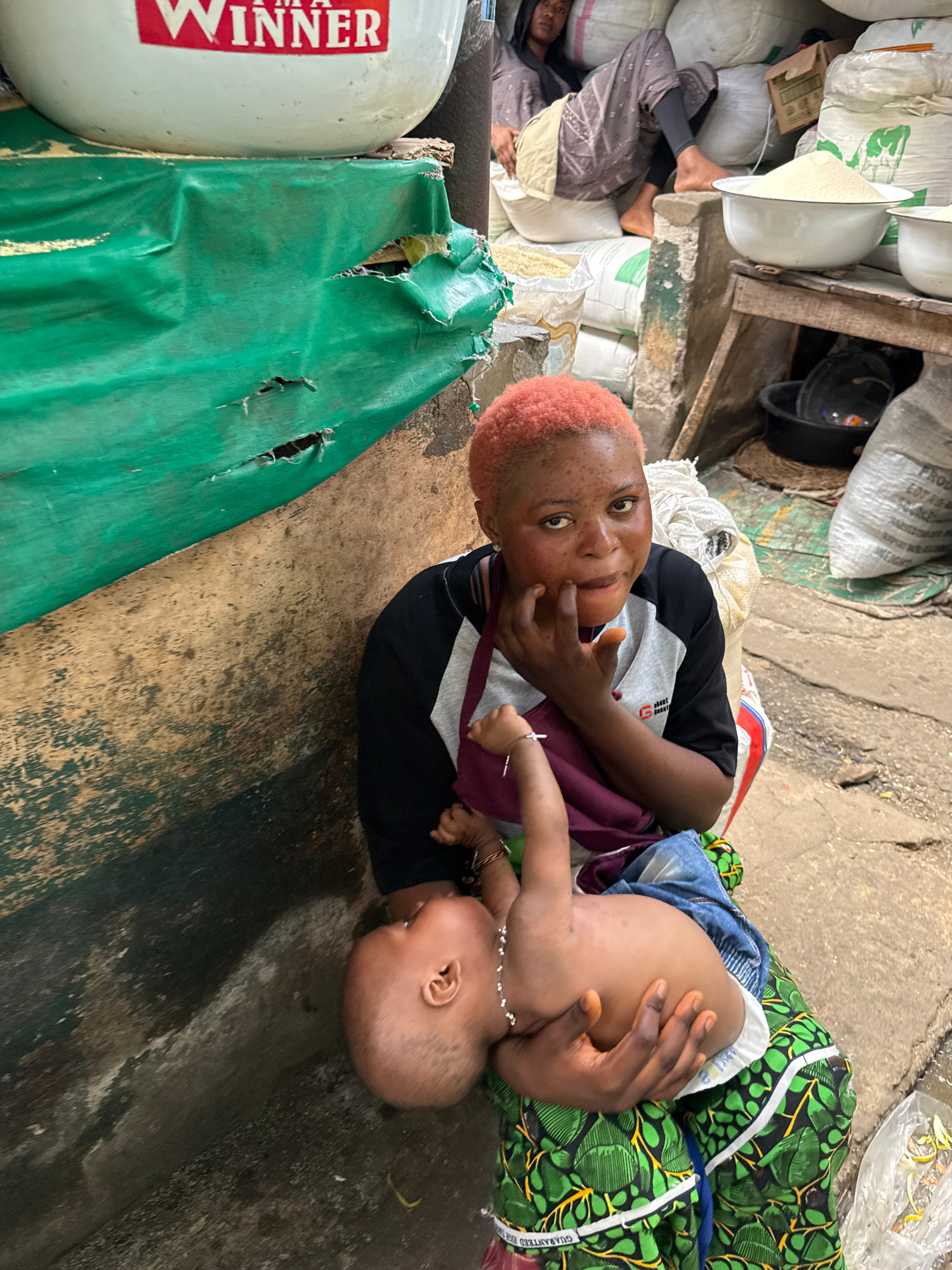This close-up, eye-level shot captures a woman holding a baby in what appears to be a bustling market or storage area in Lagos, Nigeria. The image is oriented sideways, but depicts the subjects lookin…read more