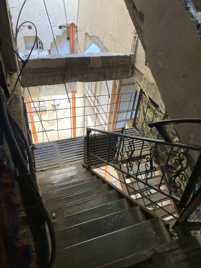 The image captures a downward view of a metal staircase within a significantly damaged multi-story building located in Khan Yunis, Palestinian Territory. The staircase features flat, worn metal treads…read more