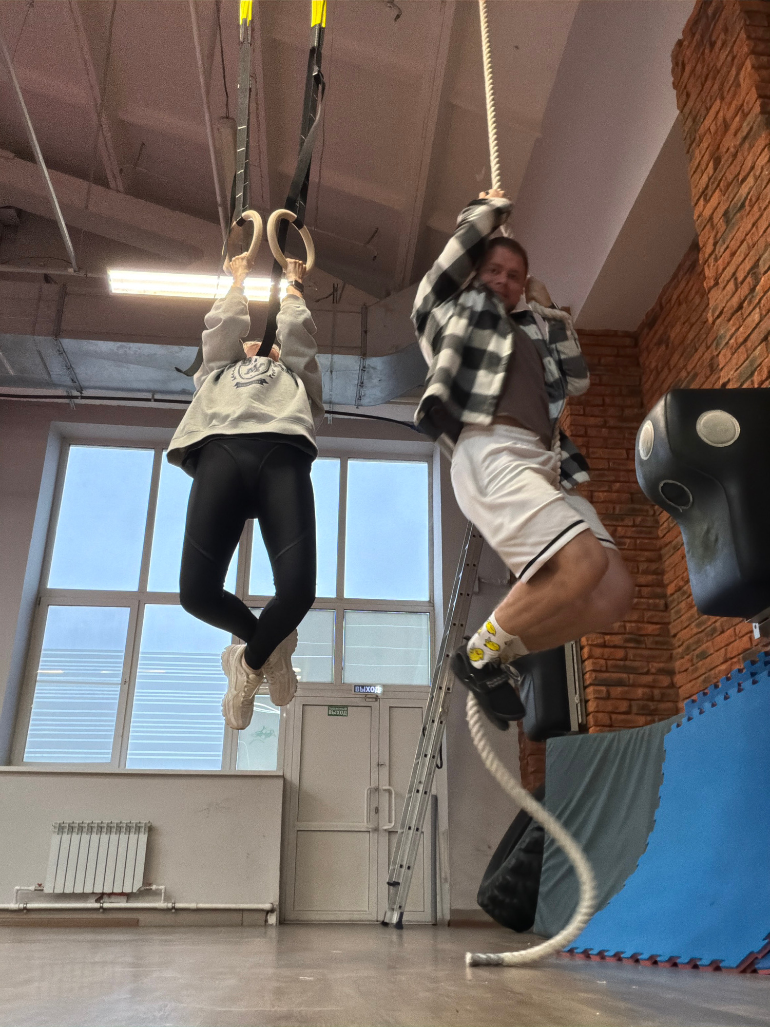 The image, taken in a gym in Chaikovsky, Russia, shows two people engaged in fitness activities. In the upper part of the image, a man with short hair, wearing a plaid shirt over a dark t-shirt, white…read more
