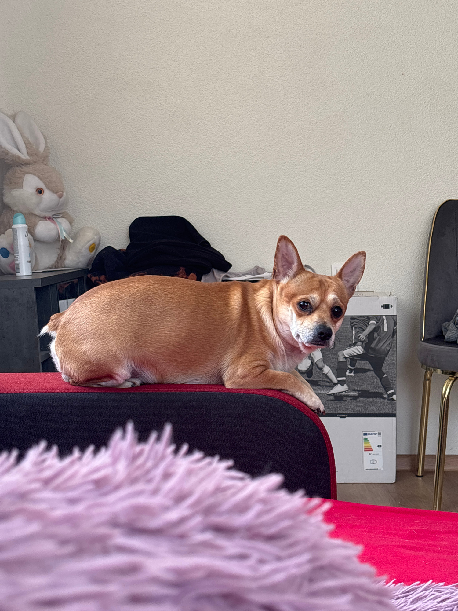 A medium shot depicts a tan Chihuahua dog reclining on the edge of a black and red chair. The dog is facing the camera with its head cocked to the left. Behind the dog and chair, there is a light beig…read more