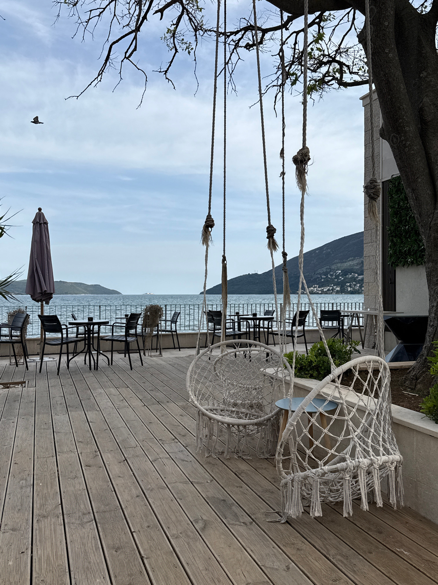 The image depicts an outdoor seating area located in Igalo, Montenegro. The scene features a wooden deck with several black chairs and tables arranged facing the water. A partially visible parasol is…read more