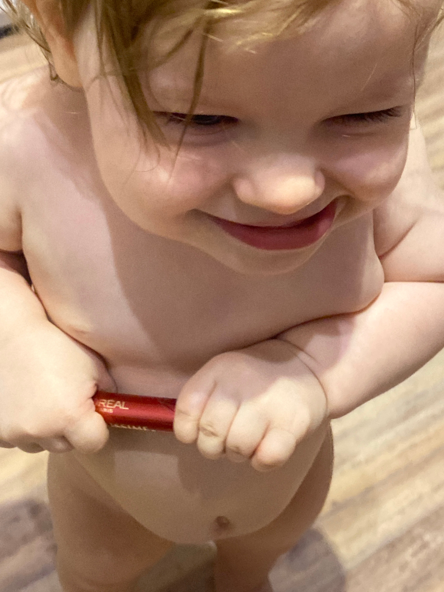 A joyful young child, appearing to be a toddler with light-colored hair and fair skin, is captured in a top-down, slightly angled shot. The child is smiling broadly, with rosy lips and visible eyelash…read more