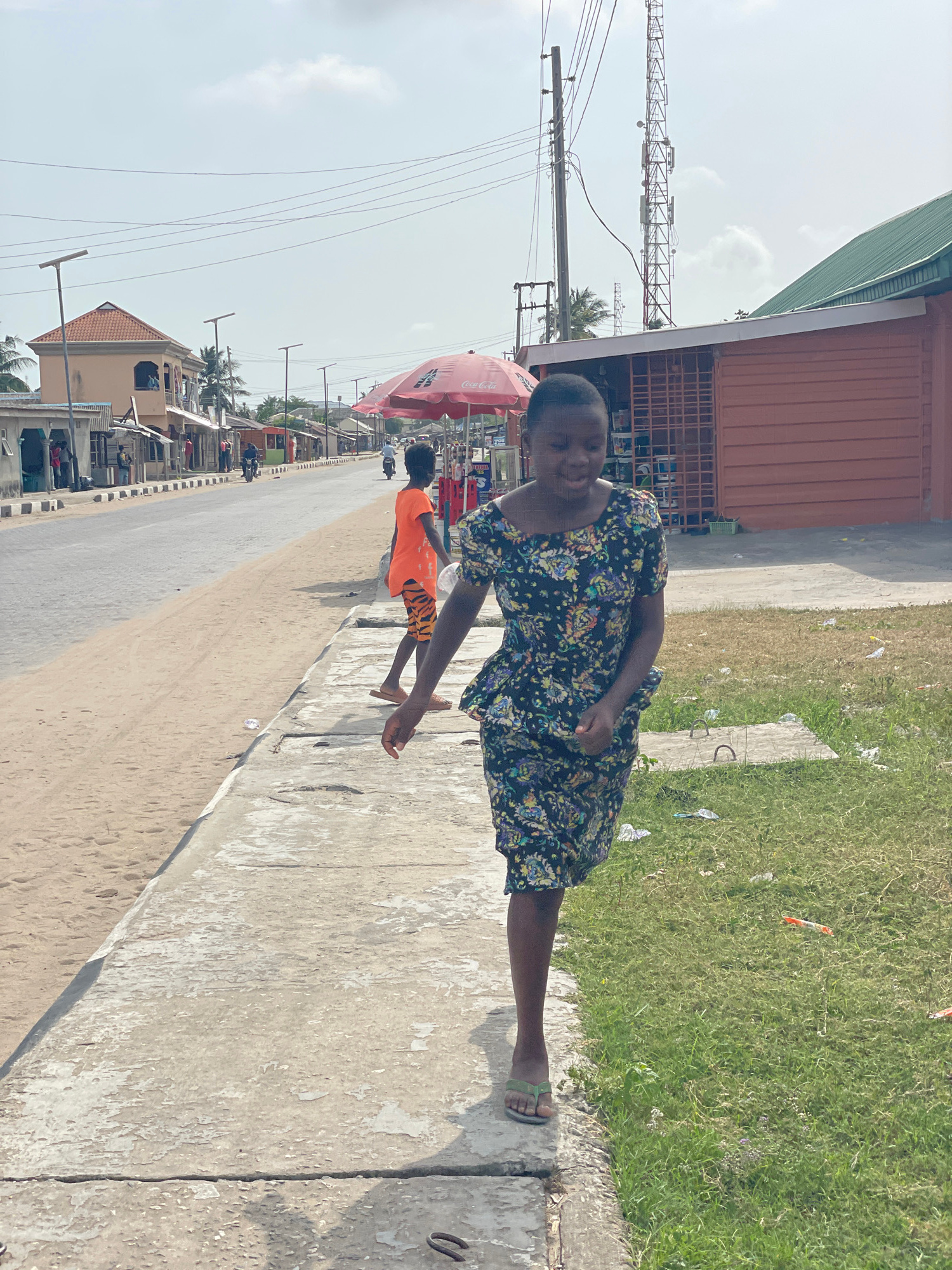 The image shows a woman in a floral dress standing on a concrete ledge next to a sandy road in Badagry, Nigeria. A boy in an orange shirt and tiger-striped shorts walks on the road to the left of the…read more