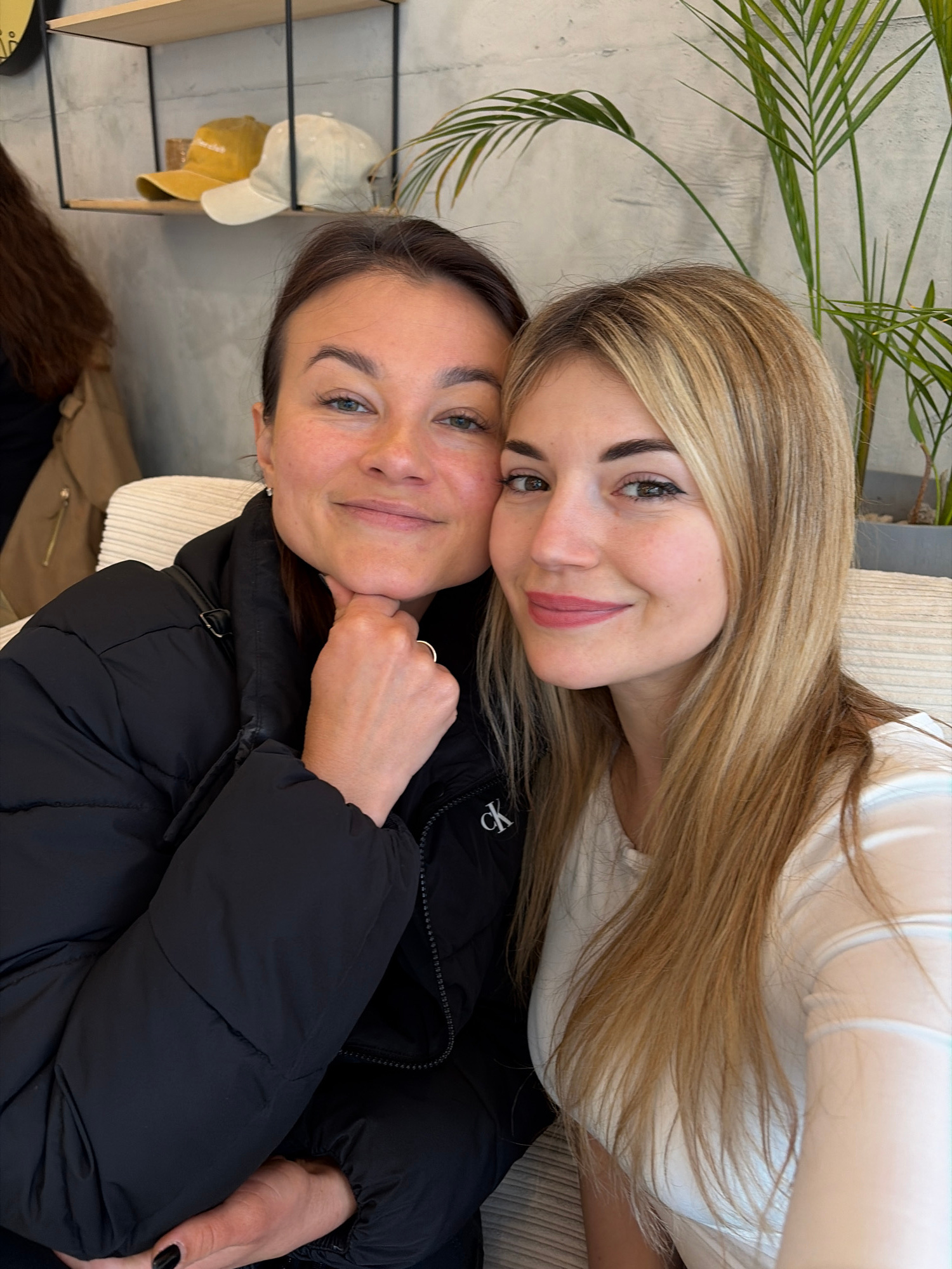 Two smiling women pose closely together indoors, likely in a cafe or restaurant setting. The woman at the top has long blonde hair and is wearing a light-colored shirt. The woman below has brown hair…read more