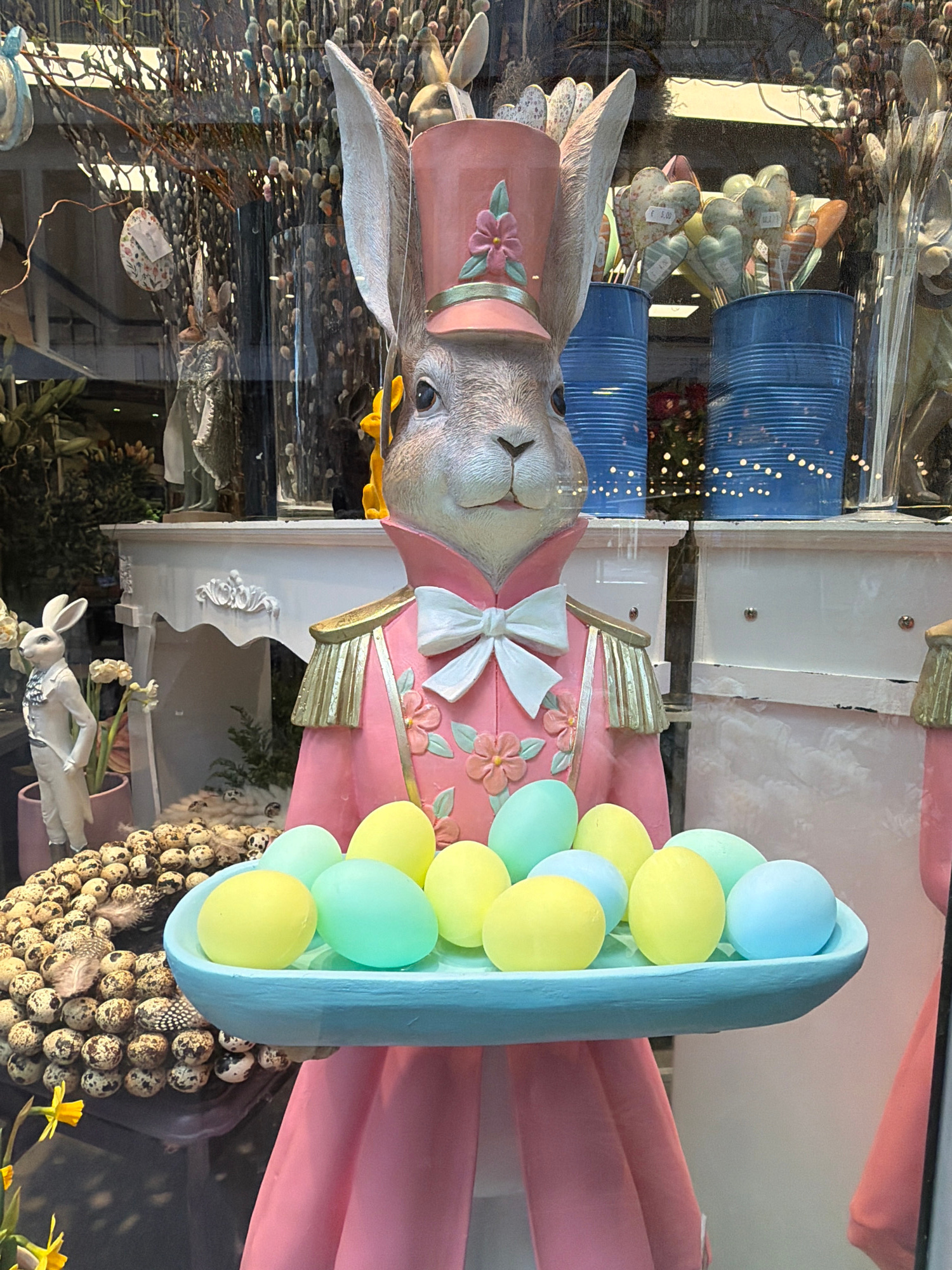 A retail window display in Luxembourg City, Luxembourg, features a large, anthropomorphic rabbit statue centrally positioned, dressed in a pink military-style uniform with gold epaulets, a white bow tie, and a pink top hat adorned with a flower. The rabbit holds a light blue, oval-shaped tray containing approximately fifteen pastel yellow and light blue decorative eggs. To the left, a smaller white rabbit statue in a suit stands beside a mound of spotted quail eggs and yellow daffodils, set against a white, ornate decorative console. To the right, two ribbed blue containers hold multiple heart-shaped decorations on sticks, some displaying price tags. The background includes bare branches with pussy willows and hanging decorative Easter eggs. Reflections of exterior elements and internal lighting, including string lights, are visible on the glass. The scene depicts an Easter-themed presentation. | Open Wire