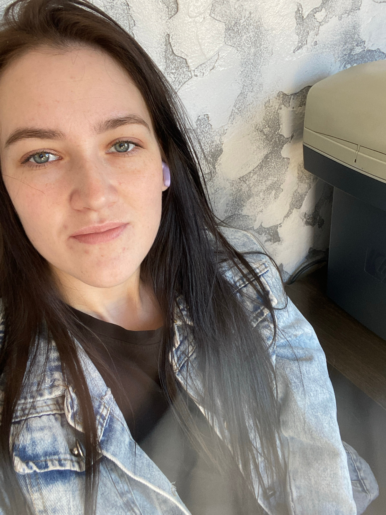A woman with fair skin, dark hair, and light-colored eyes is posing for a selfie. She's wearing a light-wash denim jacket and a dark top. A small purple object is visible in her left ear, possibly an…read more