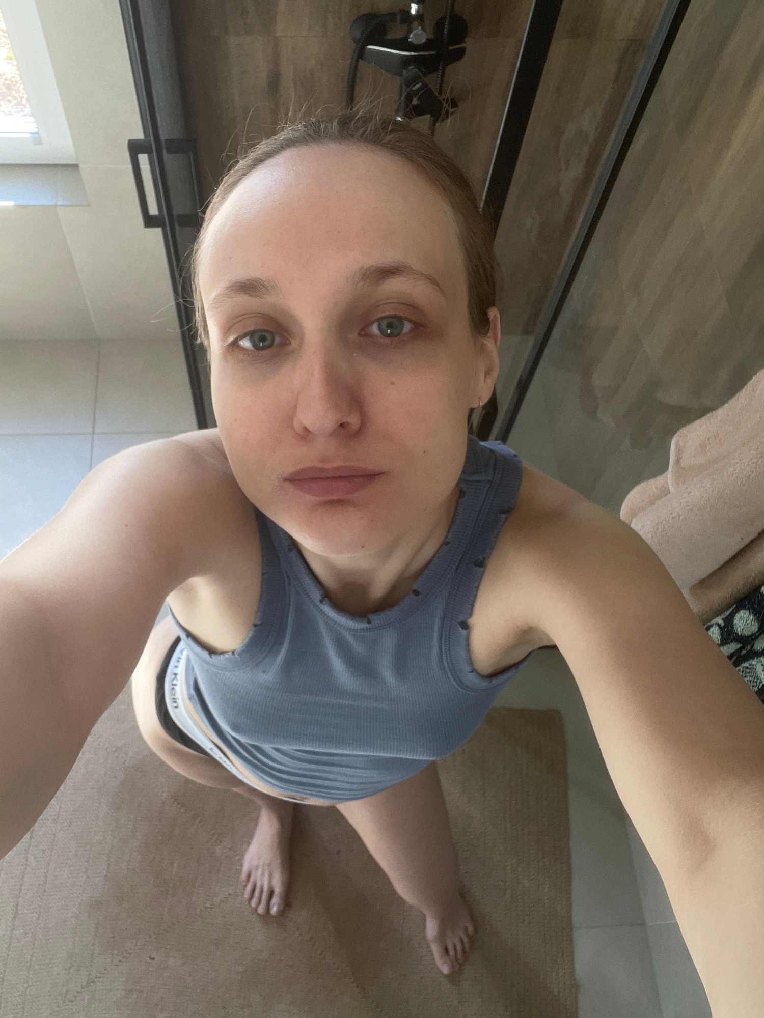 A woman is taking a selfie in a bathroom. She is wearing a gray tank top and black Calvin Klein underwear is visible. The bathroom features a glass shower door, light-colored tile walls, a beige bathm…read more