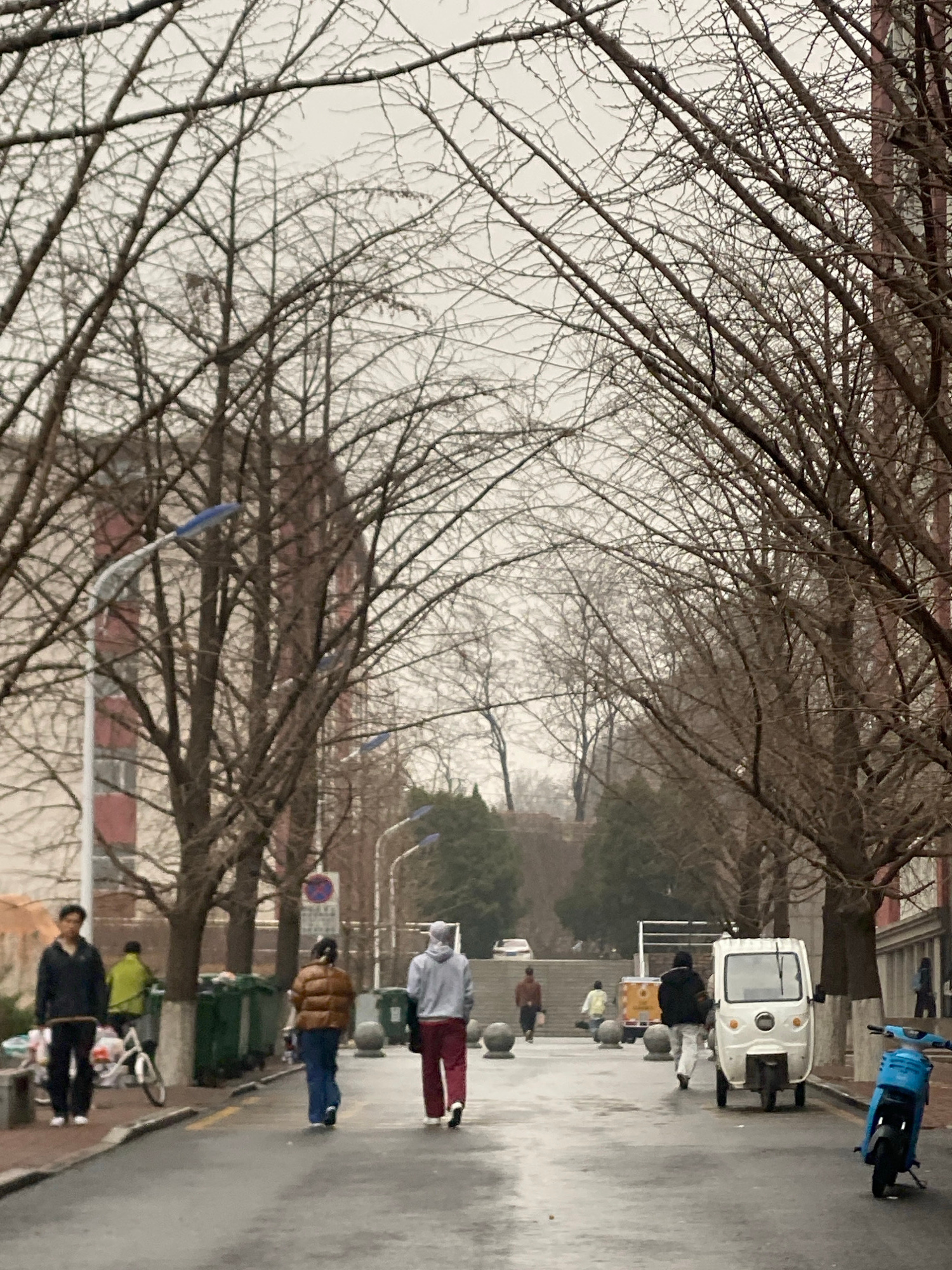 The image depicts a street scene in Zhongtun, China. The weather appears overcast or rainy, with the road surface wet and reflective. The foreground is dominated by bare tree branches without leaves,…read more