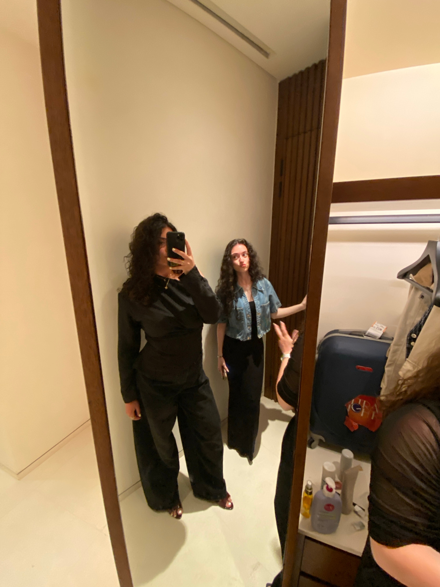 A photo of two women reflected in a large, rectangular mirror with a brown frame, likely taken in a hotel room in El Caracol, Mexico. The room contains a dark blue suitcase, a clothing rack with itemsβ¦read more