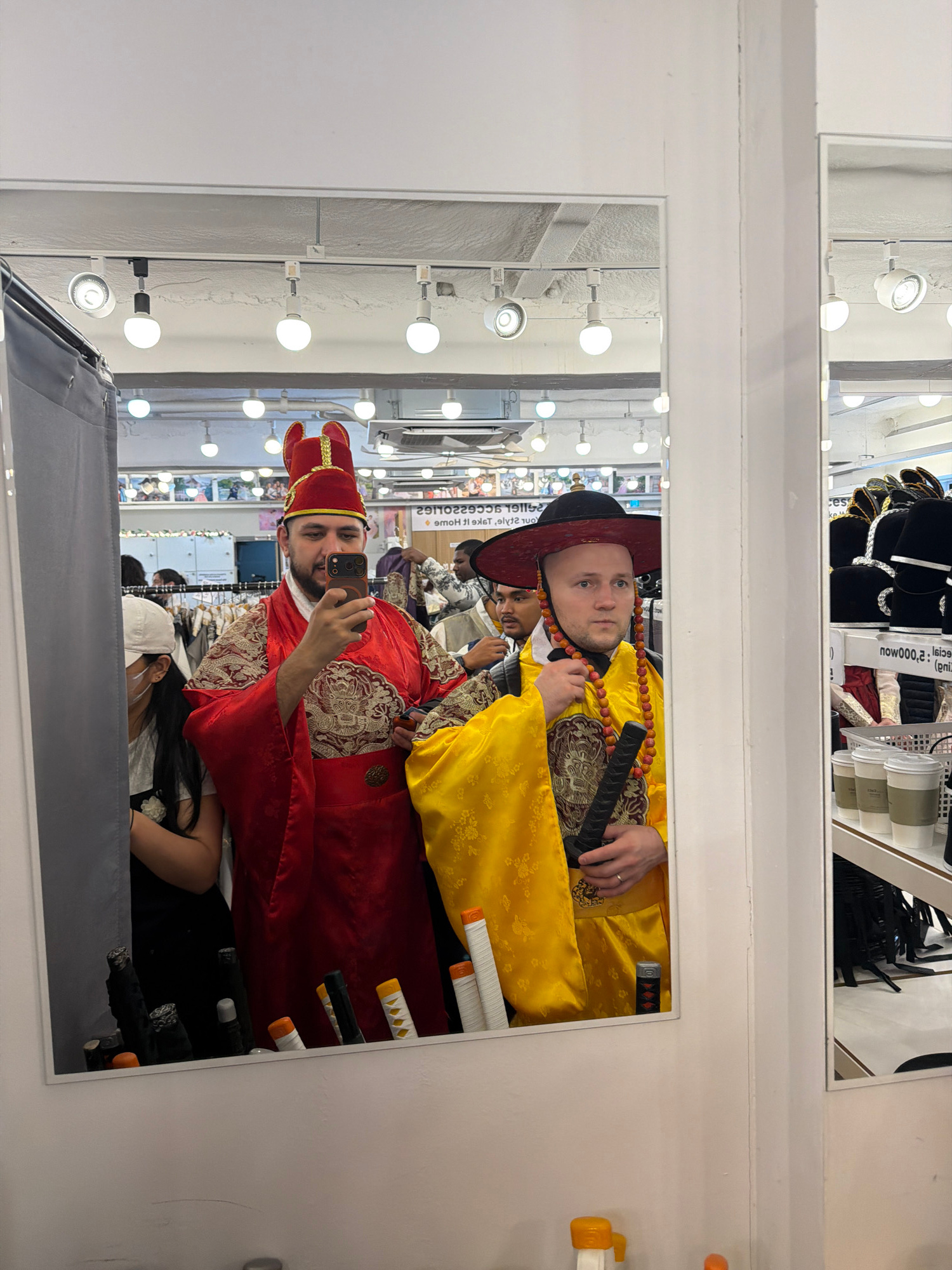 The image depicts a reflection in a large mirror within a traditional costume rental or retail store in Seoul, South Korea. Two adult males are prominently featured. The male on the left, with a bear…read more