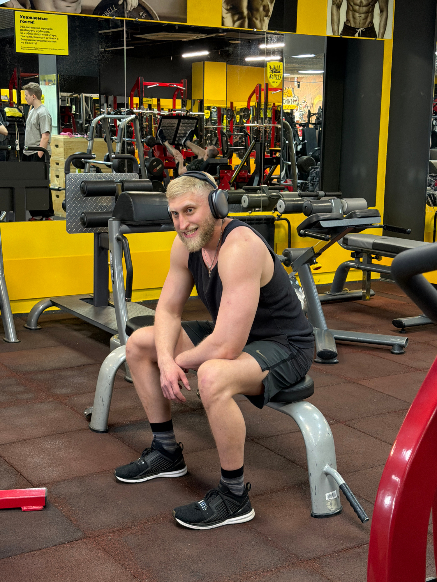 A man with blond hair and a beard is in a gym in Krasnoyarsk, Russia. He is wearing a black tank top, black shorts, and black sneakers with white soles and is positioned on a piece of exercise equipmeβ¦read more