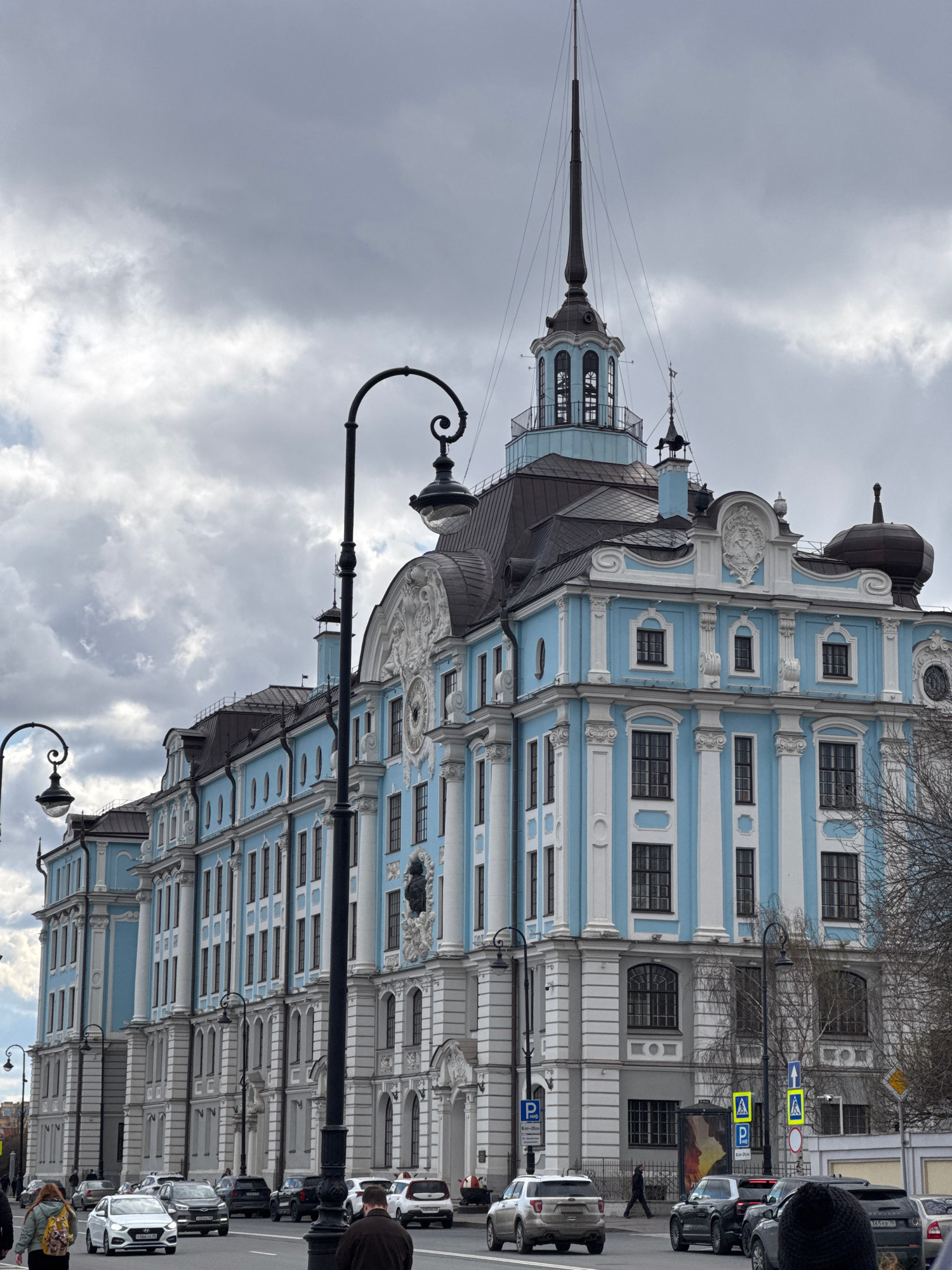 The image shows the Smolny Cathedral in Saint Petersburg, Russia, from a street-level perspective. The cathedral's blue and white facade is prominently displayed, featuring multiple windows, ornate de…read more