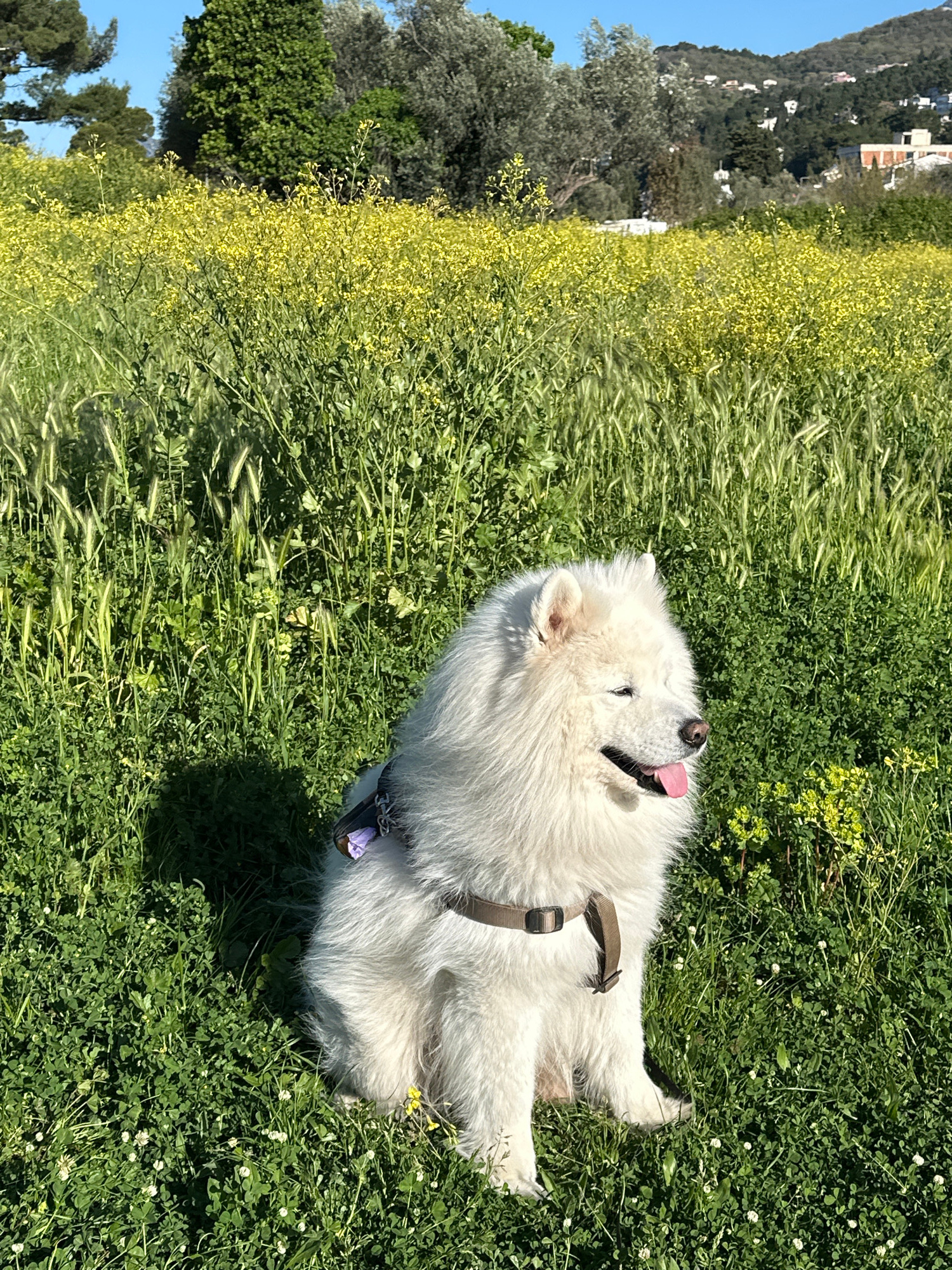 A medium-shot, eye-level, rotated photograph depicts a white Samoyed dog lying on its side in a field in the city of Šušanj, Montenegro. The dog is positioned in the center-right of the frame, with it…read more