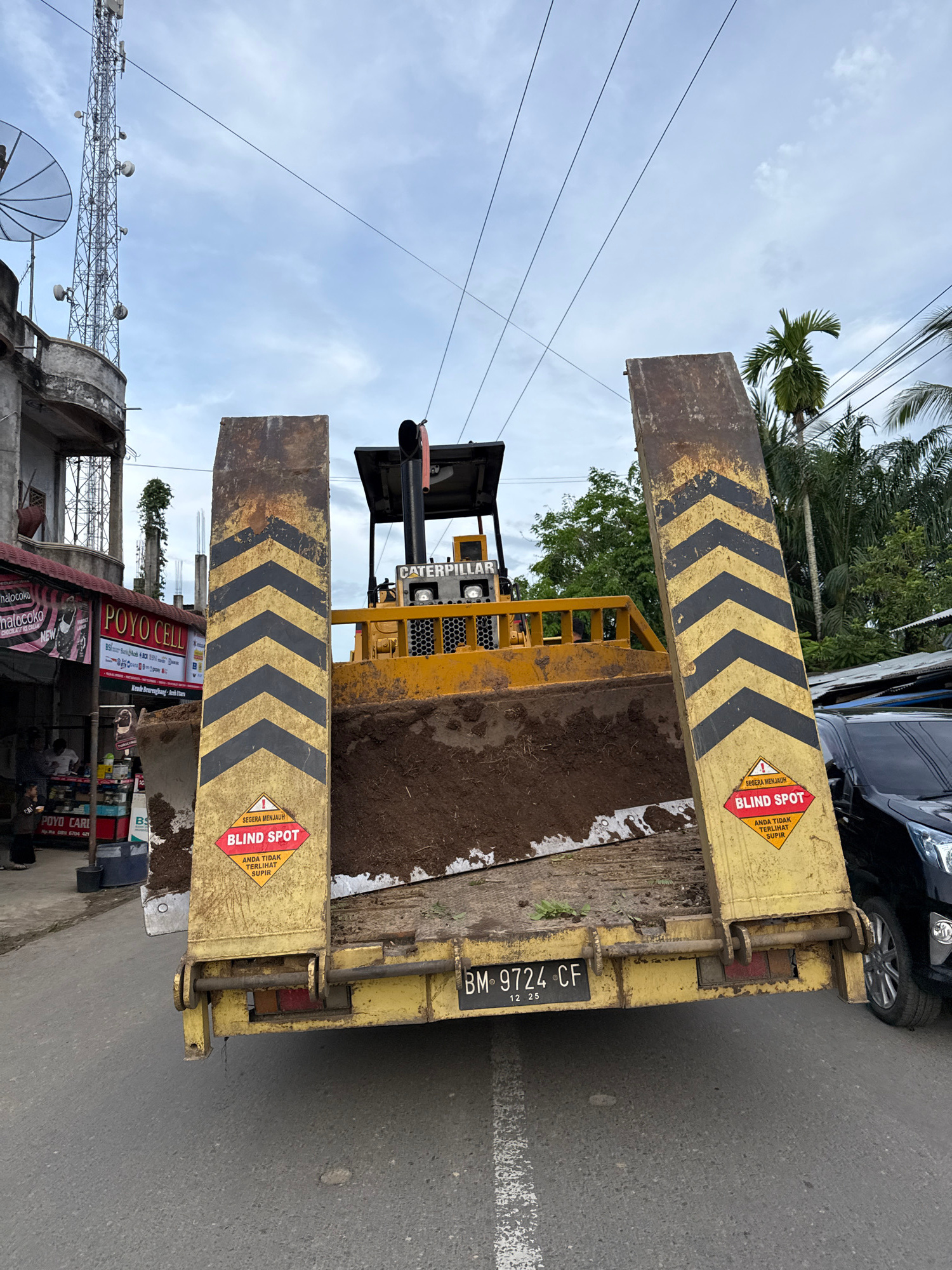 The image depicts a yellow Caterpillar vehicle on a flatbed trailer, parked on a street in Muliengmanyang, Indonesia. The trailer has black and yellow chevron markings and "Blind Spot" warning labelsβ¦read more