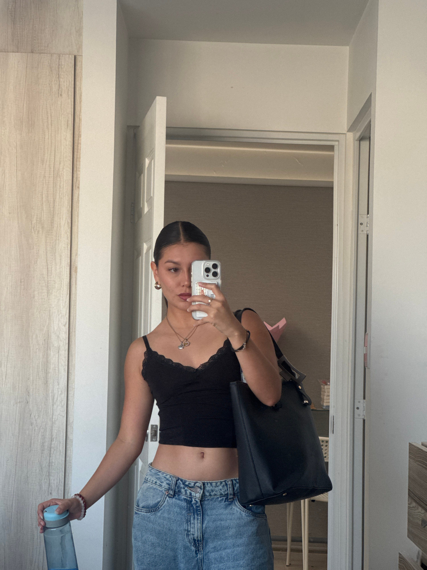 A woman stands in front of a mirror, taking a selfie with her phone. She wears a black, lace-trimmed crop top and light wash jeans. A black bag hangs from her shoulder. She holds a blue water bottle i…read more