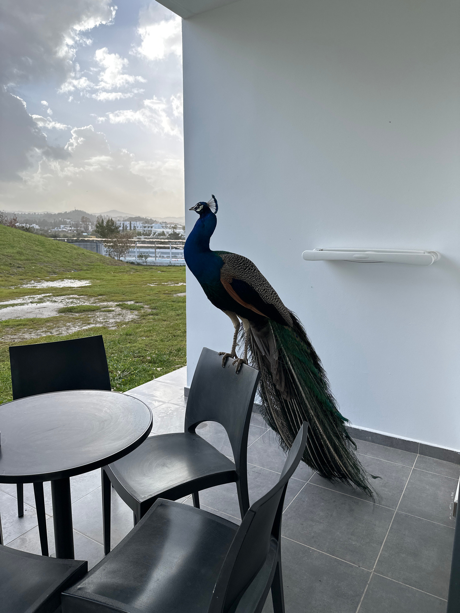 A peacock is perched on the back of a black chair on a patio. The patio has dark gray tile flooring and is enclosed by a white wall and ceiling. Outside the patio is a view of Faliraki, Greece, includ…read more