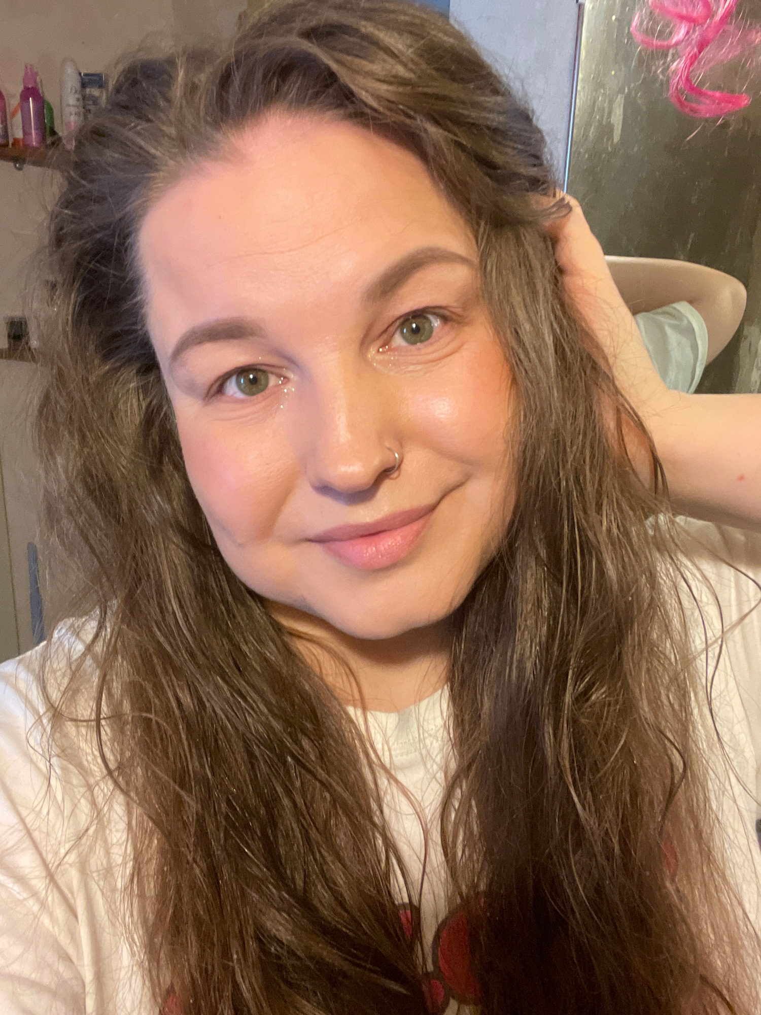 A woman with long, wavy brown hair and green eyes is pictured in a close-up, selfie-style shot. She is wearing a white t-shirt. She has a nose ring and makeup, including glitter eye shadow and blush.…read more