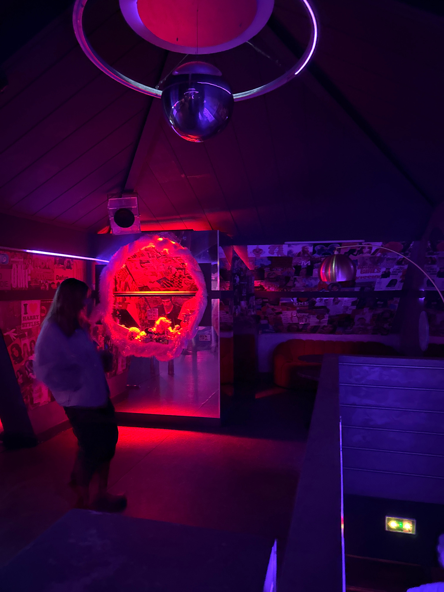 The scene depicts the interior of Le Pompon Club, located at 5 avenue de l'Opéra, 75001 Paris, France. The environment is dimly lit with dominant purple and red neon lighting. A large, reflective disco ball is suspended from the ceiling, encircled by a purple neon ring. The ceiling features dark, slatted wooden panels, and a speaker is mounted near the ceiling on the left. The walls are extensively covered with collages of music-related posters and magazine cutouts, including a prominent "I ❤️ HARRY STYLES" poster visible on the left. In the mid-ground on the left, an individual with light-colored hair, wearing a light-colored top and dark trousers, is visible in profile, slightly blurred, indicating movement. They are standing near a prominent, roughly egg-shaped decorative object, which is intensely illuminated with red light from within and has a textured, possibly fluffy or plastic, exterior. To the right, a red, U-shaped booth or bench seating is visible against the poster-covered wall. An arc floor lamp with a metallic, curved shade extends from the right background. A dark partition or counter runs across the lower right foreground. Behind this partition, a green exit sign with an arrow is visible on a dark wall. The floor is dark and reflective of the red and purple light. | Open Wire