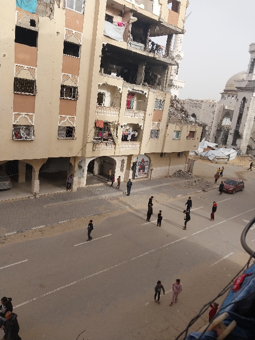 An elevated view captures a street scene in Khan Yunis, Palestinian Territory, characterized by extensive structural damage to multiple urban buildings under an overcast sky. The prominent structure…read more
