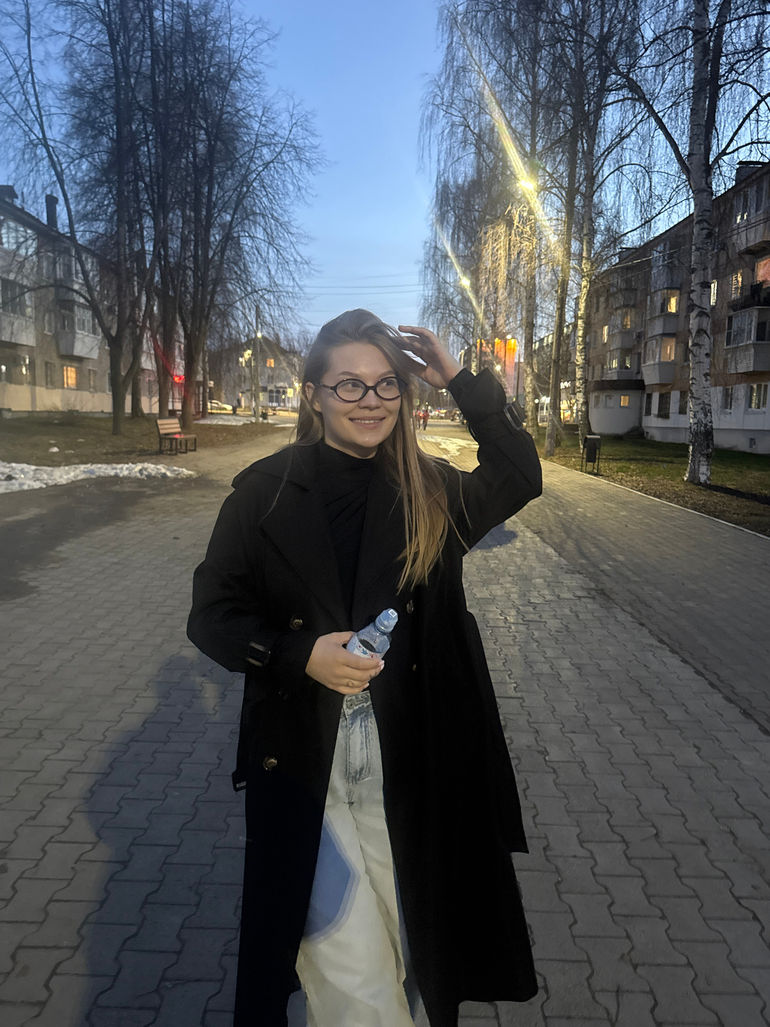 A woman stands on a brick-paved sidewalk in Chaikovsky, Russia. She is wearing glasses and a dark coat. She is holding a water bottle in her left hand and has her right hand up near her hair. The sett…read more