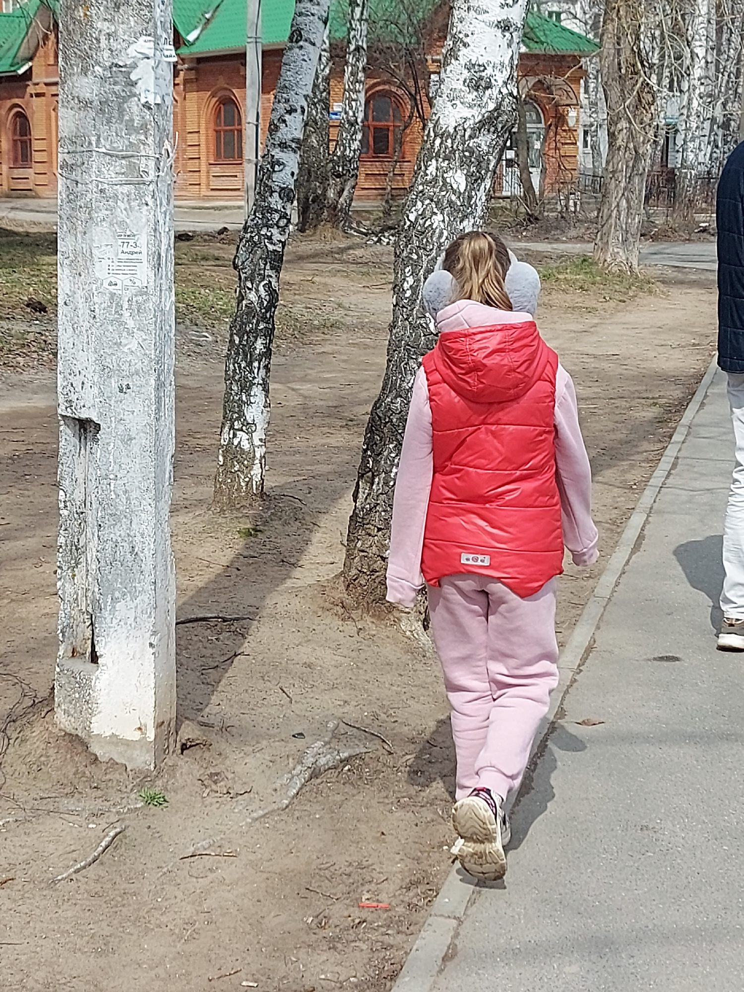 The image depicts an individual wearing a pink sweatsuit and a red vest, standing on a sidewalk next to a dirt area with birch trees and a concrete pole. Buildings with brick facades and green roofs a…read more