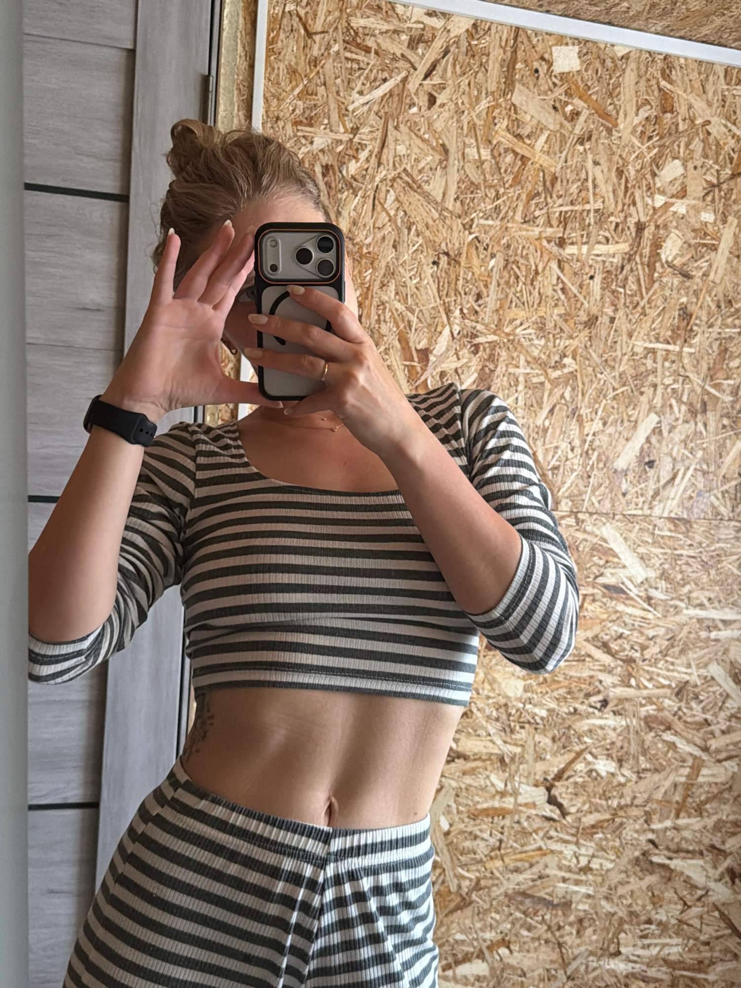 A woman is reflected in a mirror, taking a photo of herself with a smartphone that has a smiley face on the back. She is wearing a striped, form-fitting top with long sleeves and appears to be wearing…read more