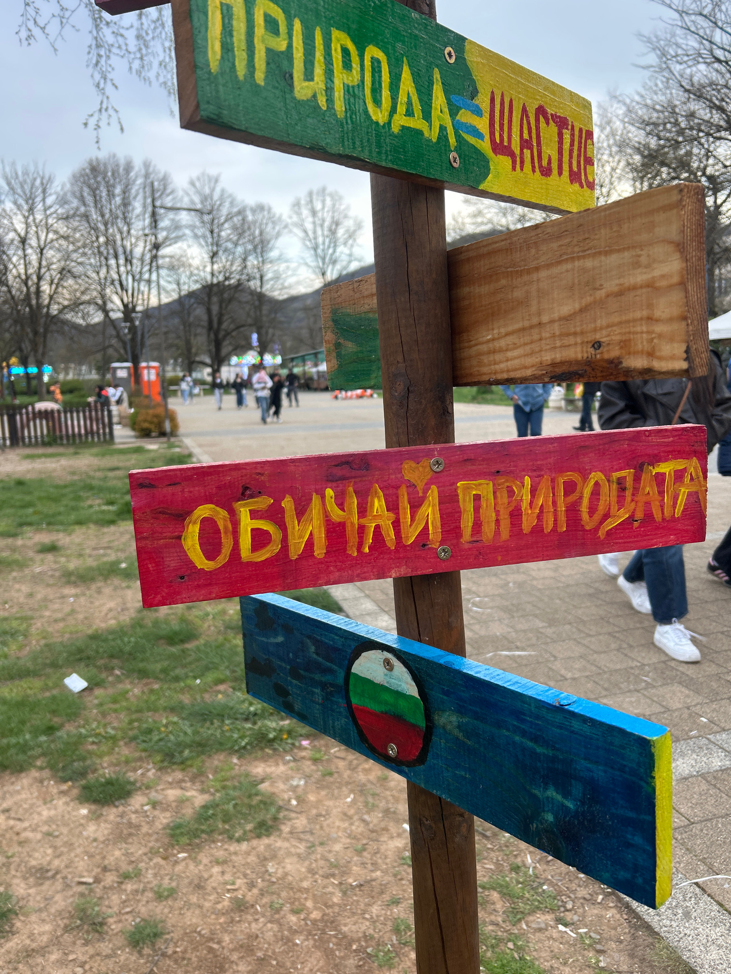 The image shows a wooden signpost with several painted wooden planks attached to it. The signpost is located in Botevgrad, Bulgaria, likely in a park or public area. One plank, painted green and yell…read more