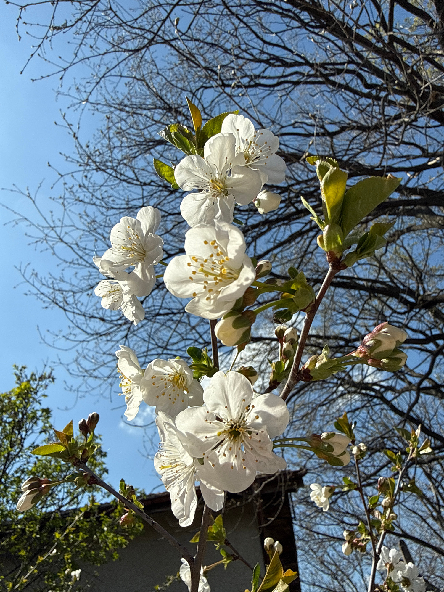 The image shows blooming white flowers on branches against a blue sky and bare tree branches. Some green leaves and flower buds are visible. The location is likely Klokotnitsa, Bulgaria, but there are…read more