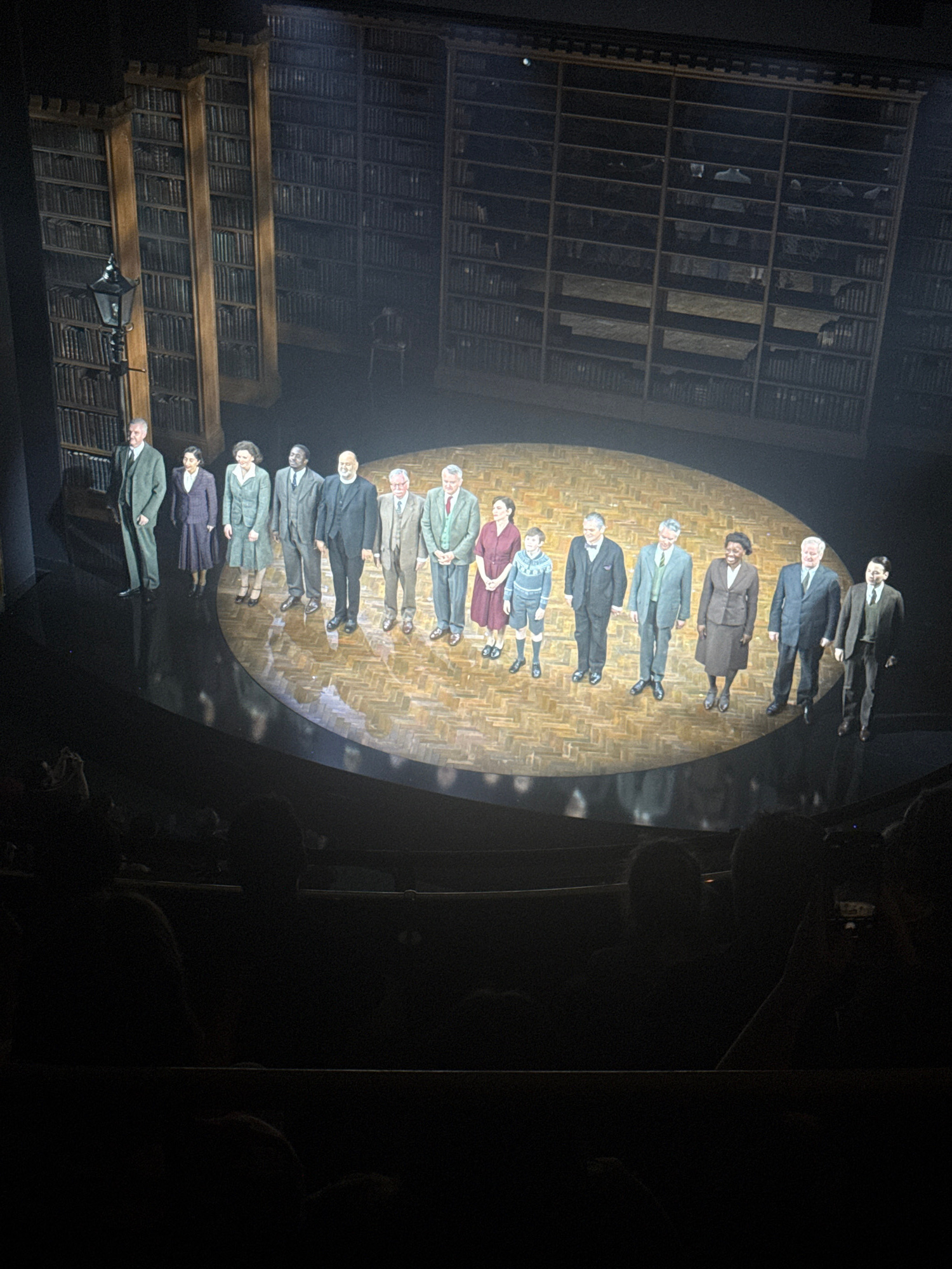 The image shows a scene from the stage production of "Harry Potter and the Cursed Child" at the Palace Theatre in London, United Kingdom. The set depicts a scene from a library or historical archive,…read more