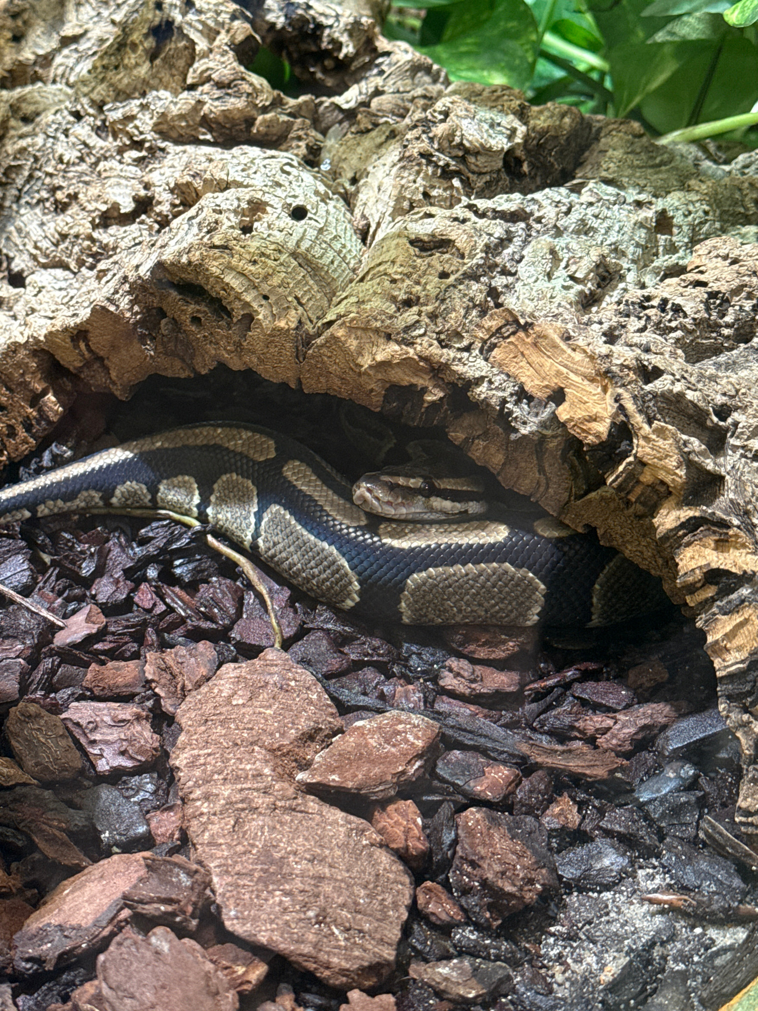 A ball python (Python regius) is observed resting partially concealed within a hollowed piece of cork bark. The snake's body exhibits a distinct pattern of dark brown to black irregular blotches borde…read more