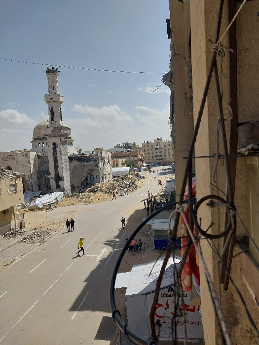 This image depicts a street scene in Khan Yunis, Palestinian Territory, captured from an elevated perspective. The immediate foreground on the right displays a section of a light brown building exteri…read more
