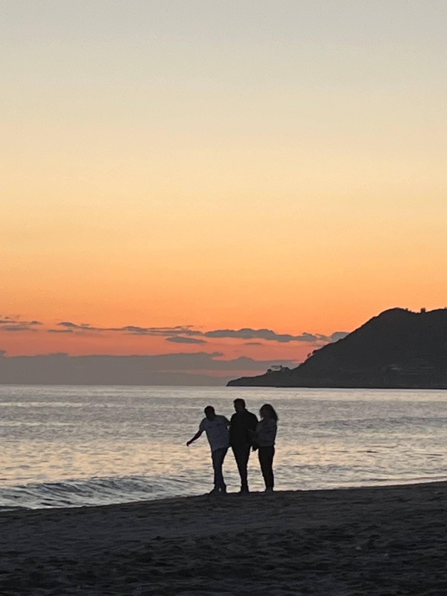 The image captures a sunset scene on the beach in Alanya, Turkey. The sky is transitioning from light yellow to orange near the horizon. There is a dark landmass in the background to the right of the…read more