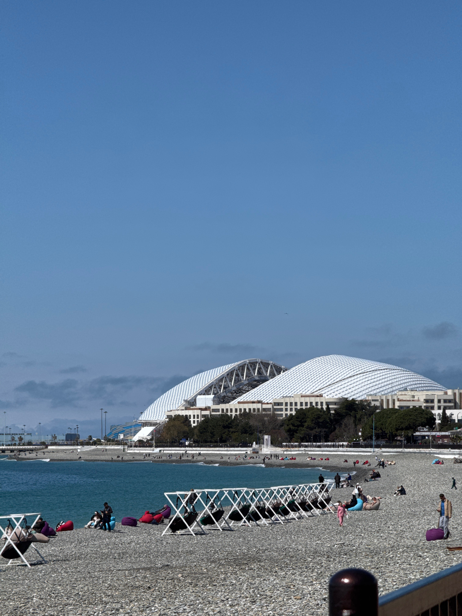 View of Fisht Olympic Stadium in Sirius, Russia. **Environment:** Clear blue sky on the left. To the right of the stadium is a beach with pebbles. **People:** People are reclining on the beach and s…read more