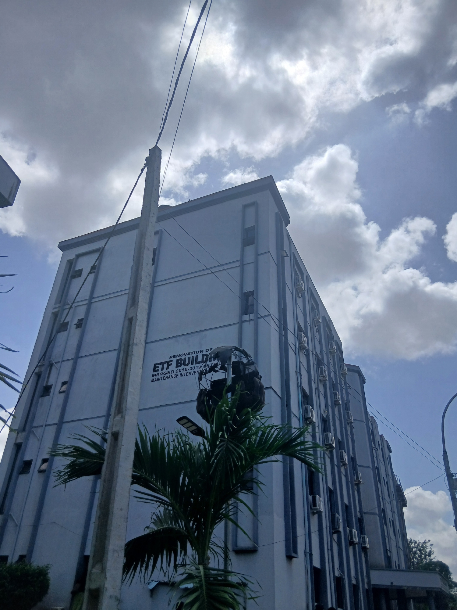 A low-angle view of a tall, light gray building against a partially cloudy sky. The building is identified as the ETF building with the words "RENOVATION OF ETF BUILDING MERGED 2016-2019..." visible o…read more