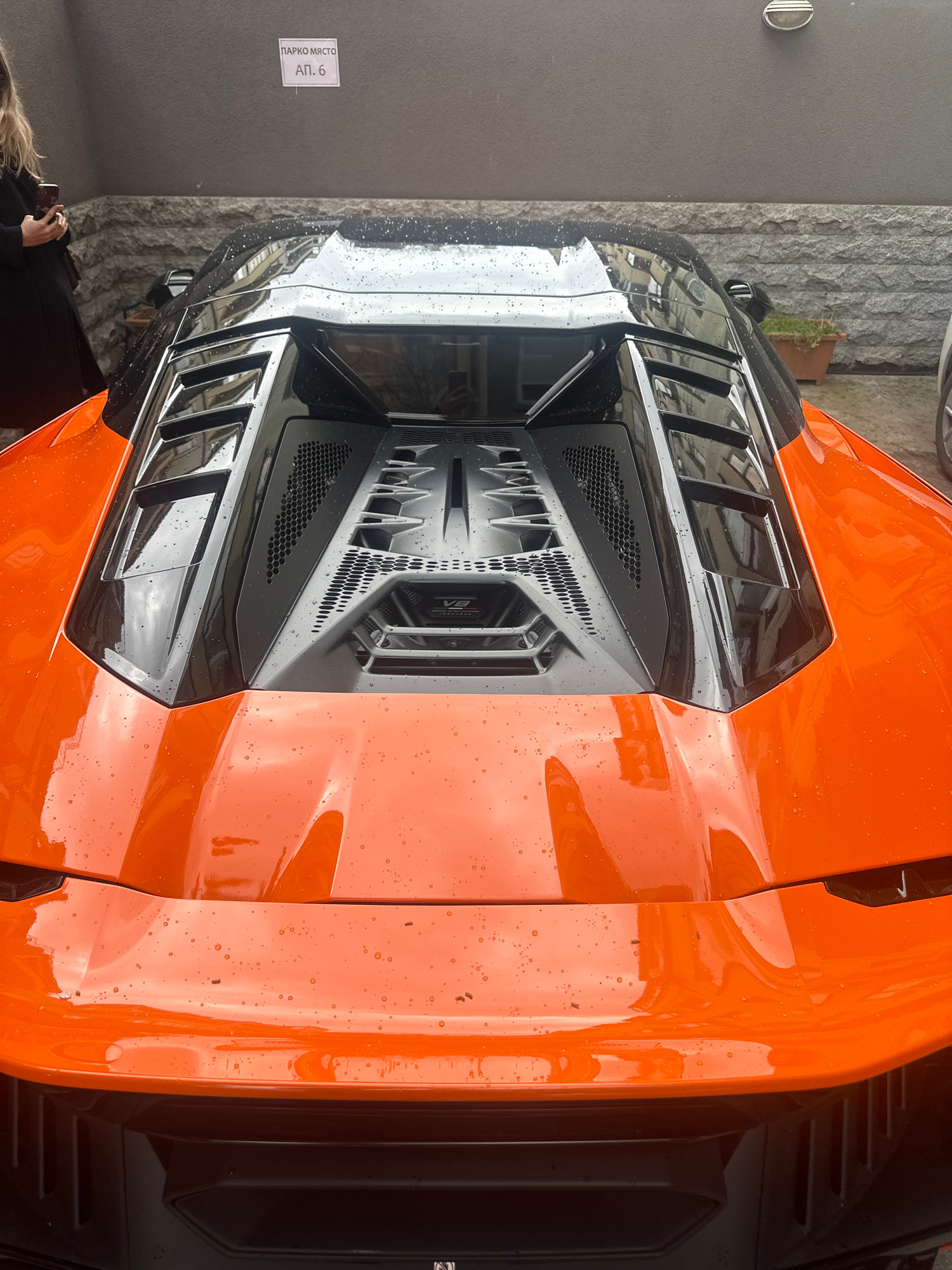The image shows a close-up, top-down view of the rear of an orange and black Lamborghini sports car. Water droplets are visible on the car's surface. The car is parked next to a gray wall, to which a…read more