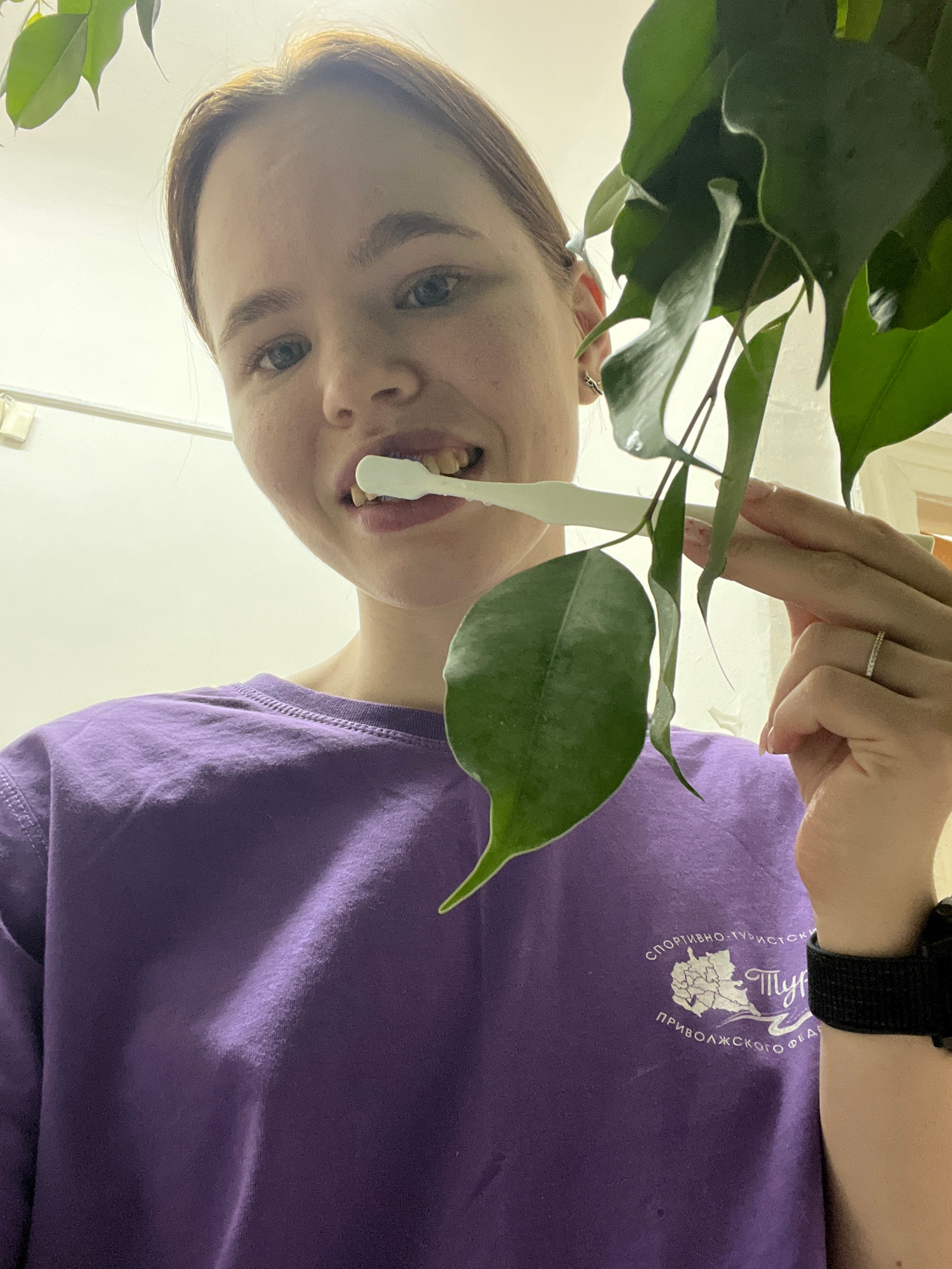 A low-angle, upward-facing shot shows a woman holding a ficus plant. She is fair-skinned with blue eyes and light brown hair pulled back. She wears a purple t-shirt with Russian text and an emblem dep…read more