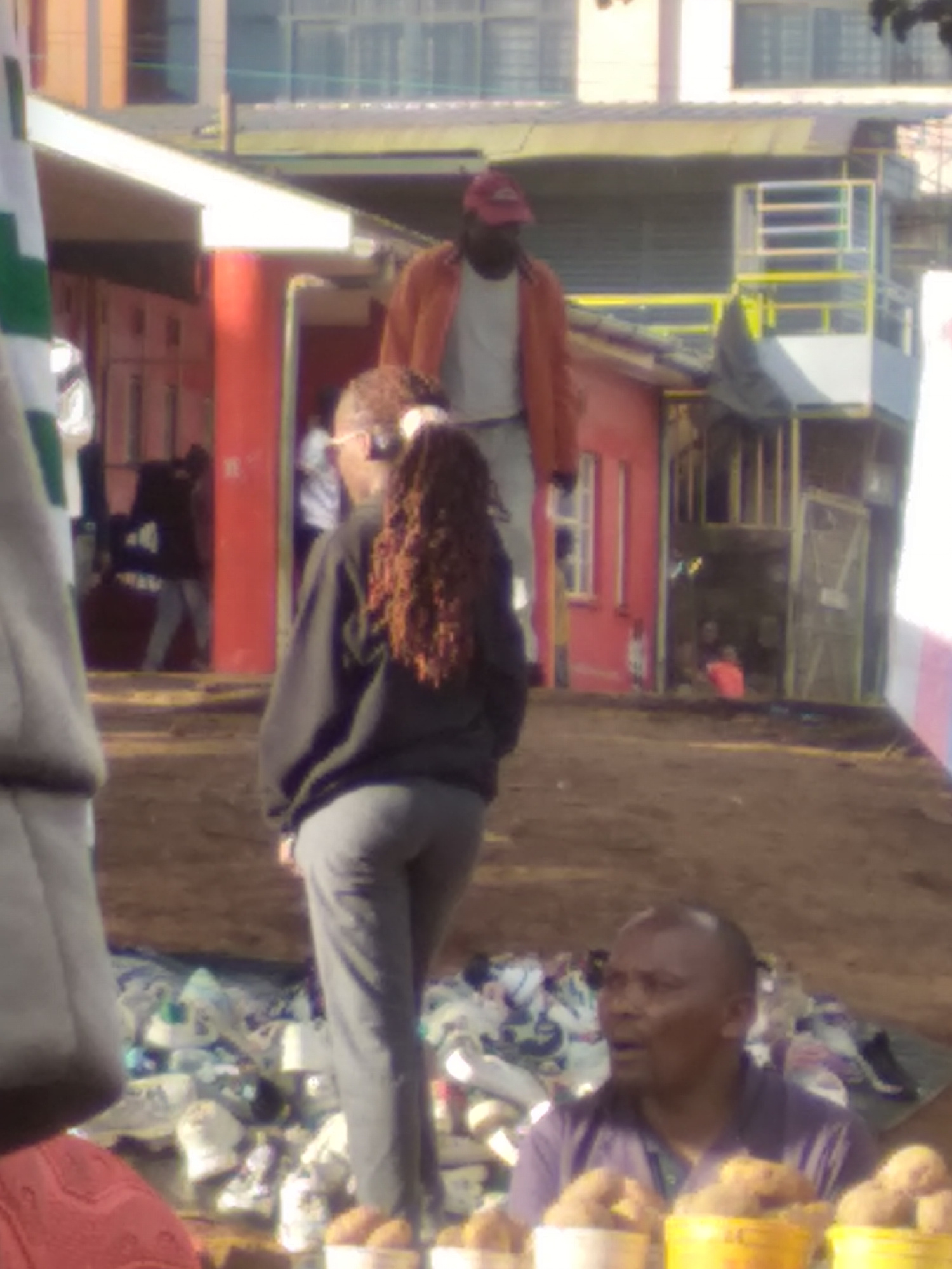 The image shows a street scene in what appears to be Nyeri, Kenya. A group of people are visible near a building painted red. At least two adults are present, along with what appears to be another adu…read more