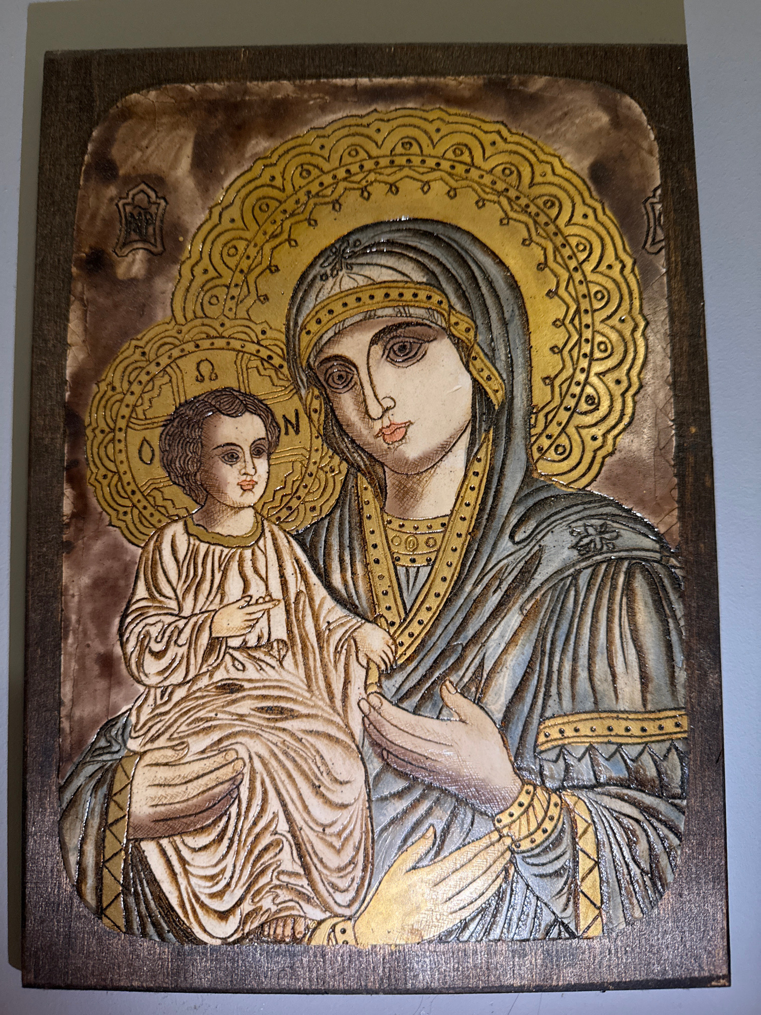 The image is a religious icon, likely a carved or pyrographically detailed wooden panel, depicting the Virgin Mary and the infant Jesus Christ in a style characteristic of Orthodox Christian iconograp…read more