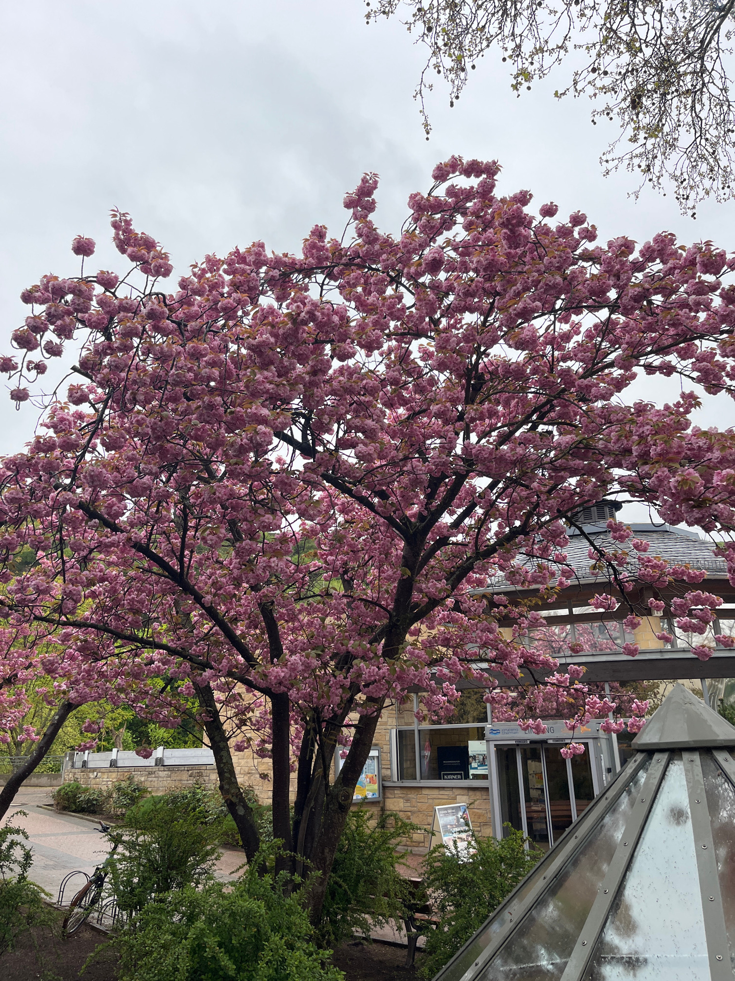 The image shows a blossoming tree with pink flowers in front of a building with a glass-covered entrance, likely a business or public facility, in Bad Kreuznach, Germany. The sky is overcast. The fore…read more