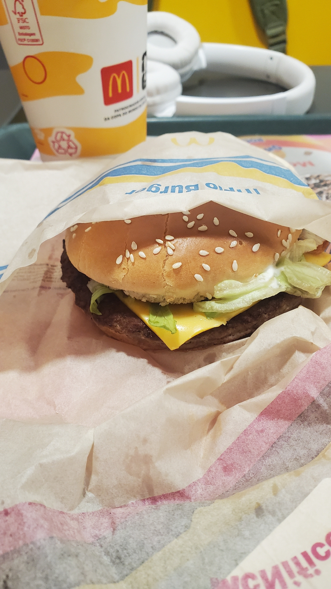 The image presents a close-up, overhead view of a McDonald's burger inside its packaging, alongside a McDonald's beverage cup and white headphones. The burger is partially visible, showing a sesame se…read more
