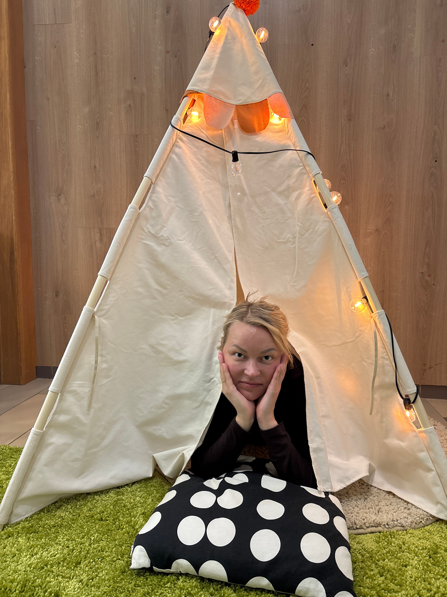 A woman is lying inside a white teepee tent decorated with string lights. She is resting her face on her hands and looking directly at the camera. To her right is a black and white polka-dot pillow on…read more