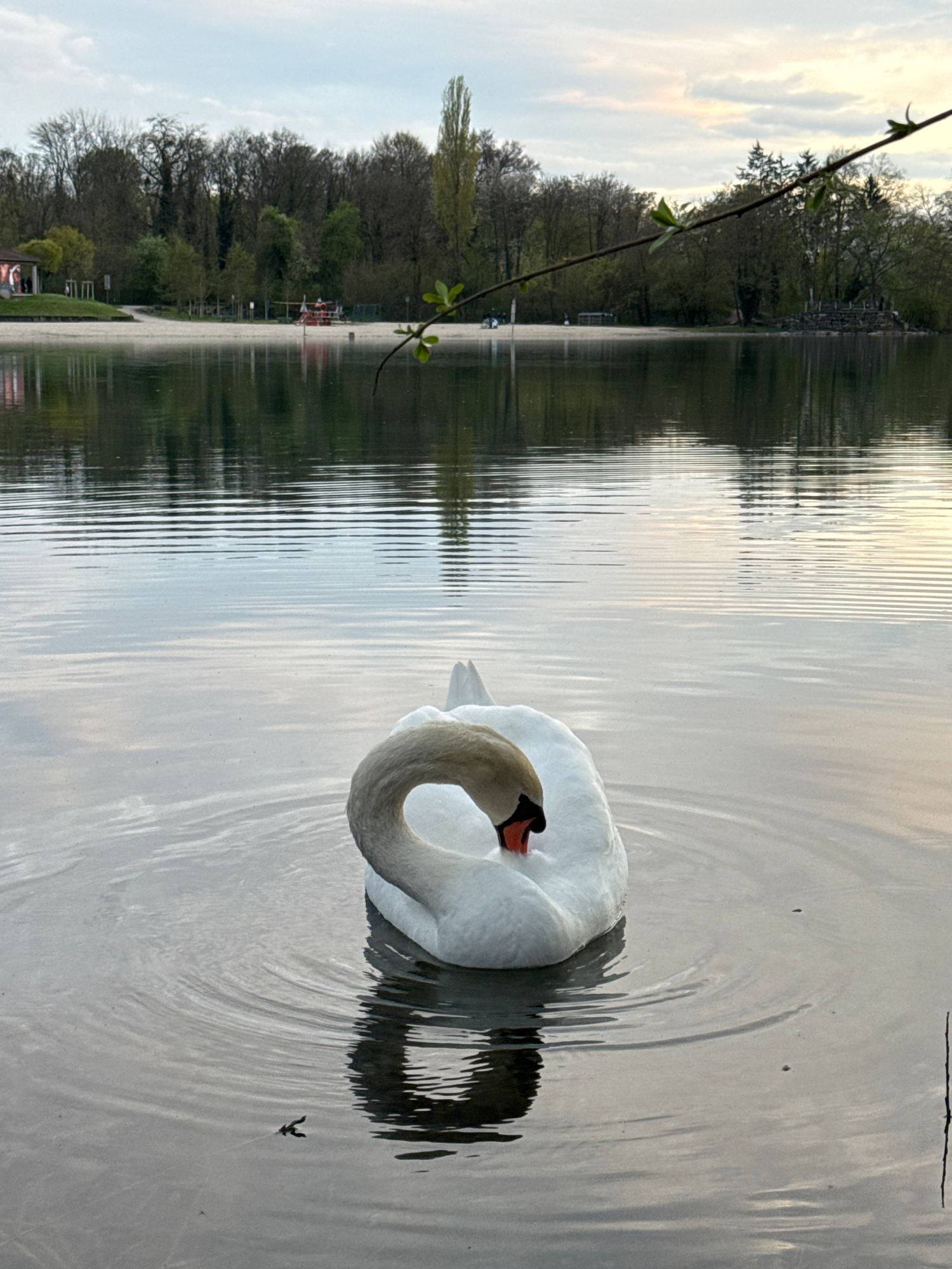 The image shows a swan swimming in a body of water, likely a lake or large pond. The swan is white with a black beak and an orange tip. It is positioned in the water with its neck curled back, resting…read more