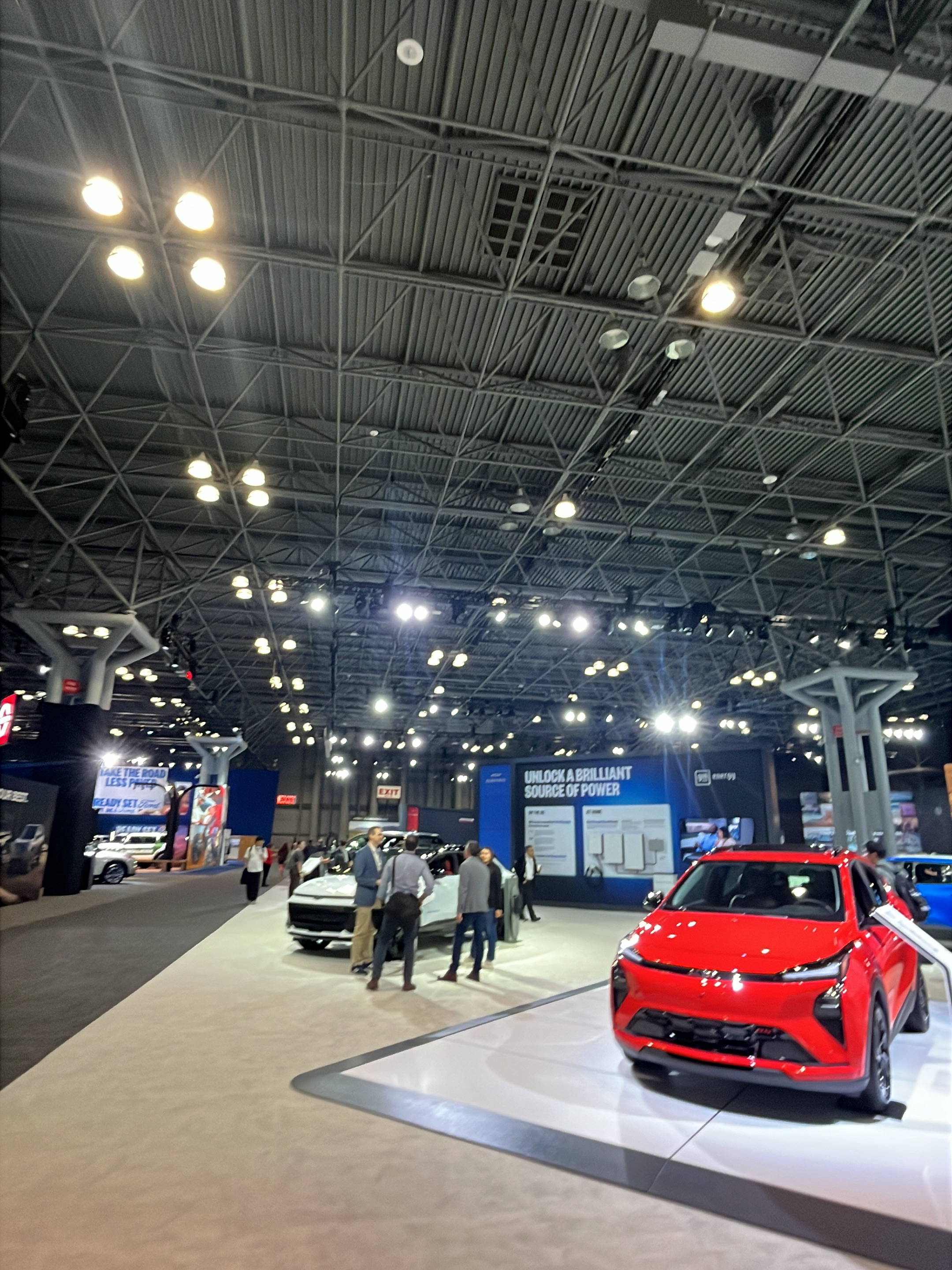The image captures a scene inside a large convention hall, likely at a public event. The space is brightly lit by numerous ceiling-mounted lights affixed to an intricate network of metal framework tha…read more
