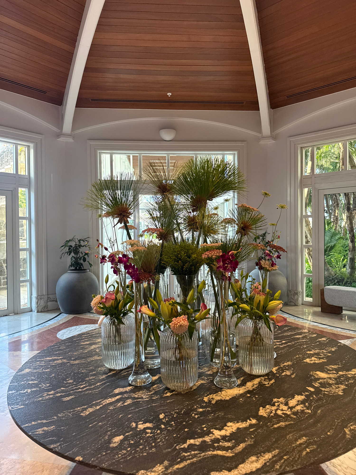 The image depicts an interior space featuring a large round table with a dark, granite-like surface adorned with multiple glass vases filled with floral arrangements. The flowers consist of assorted b…read more
