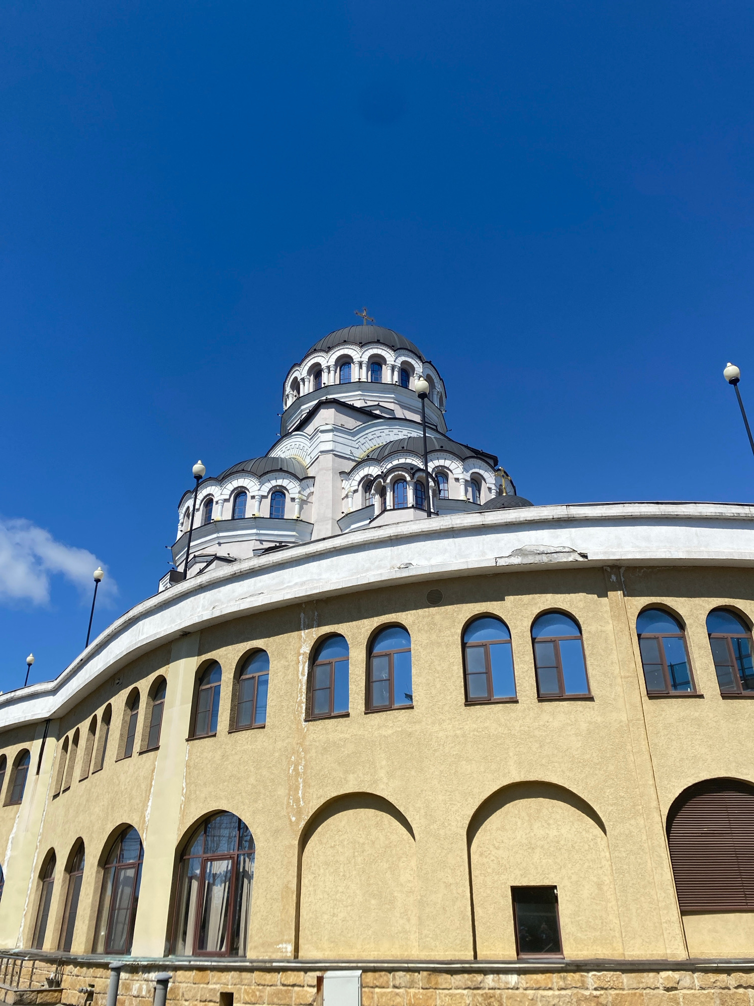 The image depicts the architectural elements of buildings in Sirius, Russia, viewed from a low angle. On the left, the domes and upper structure of an Orthodox church are visible against a clear blue…read more